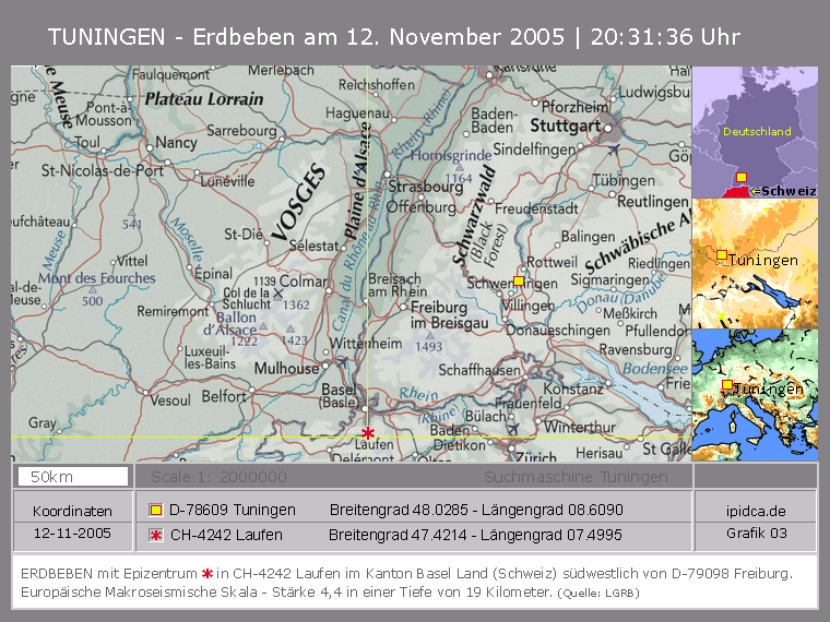 » Wieder am Wochenende erschütterte ein schwaches Erdbeben 1 Sekunden lang die Erdoberfläche von D-78609 Tuningen (Schwarzwald-Baar-Kreis im Süden von Baden-Württemberg). Durch den Ausläufer des Bebens war ein kurzes lautes Knacken der Holzdecke im Wohnzimmer warnehmbar. Das Epizentrum lag nach dem [LGRB] in CH-4242 Laufen im Kanton Basel Land (BL) mit einer Stärke von 4,4 bzw. nach dem schweizerischen Erdbebendienst im Kanton Aargau (AG) in CH-5070 Frick mit einer Stärke von 4,1 auf der Richterskala. Laufen liegt im Nachbargrenzland, der Nordwestschweiz ca. 102 km südwestlich von D-78609 Tuningen entfernt, in der Nähe von D-79539 Lörrach (24 km).