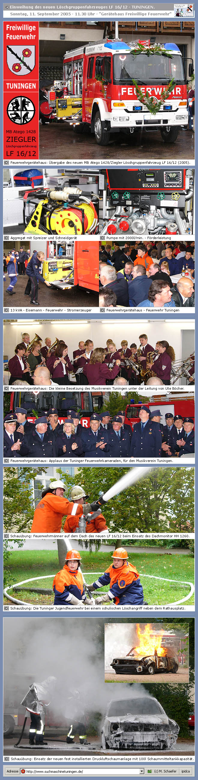 Im Gerätehaus der Freiwilligen Feuerwehr Tuningen fand die offizielle Übergabefeier für das neue Löschgruppenfahrzeug LF 16/12 (Jahr-2005) statt, welches das 29-jährige TLF 16/25 (Jahr-1976) ablöst. Die Feierlichkeiten begannen um 10.00 Uhr mit dem Frühschoppen. Als erster Redner um 11.30 Uhr, trat der Tuninger Feuerwehrkommandant Reinhard Link an das Rednerpult. Link begrüsste Bürgermeister Jürgen Roth, den Gemeinderat, die Gäste und Feuerwehrkameraden, den evang. Pfarrer Andreas Heid und den Pastor Hans Weisenberger der evang. - method. Johanneskirche, und den Kreisverbandsvorsitzenden Manfred Bau, der für die Zuschüsse verantwortlich war. Desweiteren den Musikverein Tuningen, der die Übergabe musikalisch umrahmt hatte, das DRK Tuningen und die Pressevertreter sowie die Feuerwehrkameraden der umliegenden Gemeinden. Pastor Hans Weisenberger der evang. - method. Kirche erinnerte an den 11. September 2001 in New York, die Feuerwehrleute seien es gewesen, die als erste den Kopf hinhalten mussten. Ein gemeinsames Gebet schloss die Pfarrerreden ab.