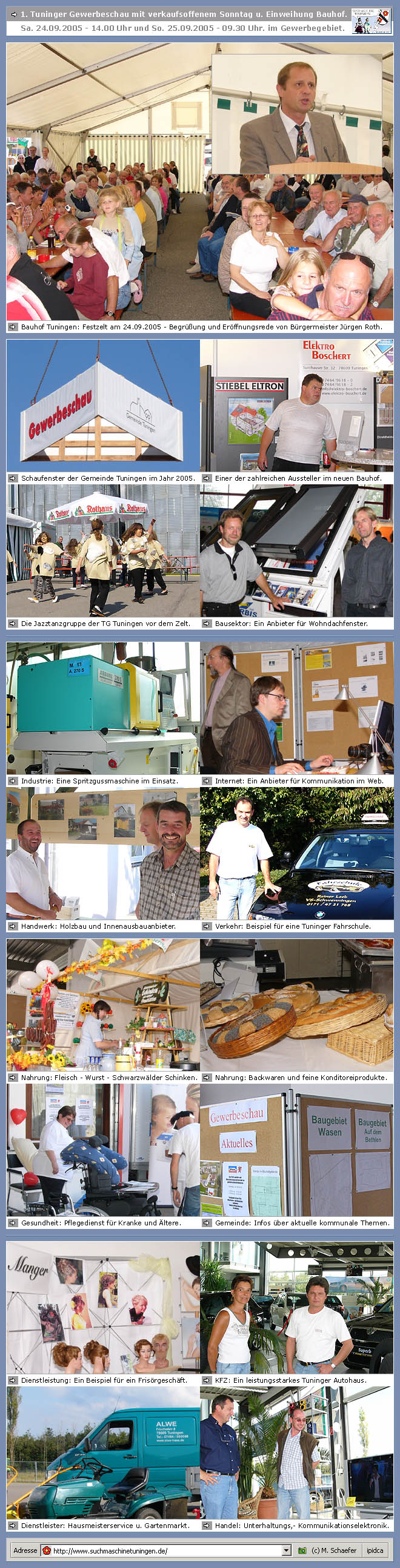Am Samstag von 14 bis 18 Uhr und am verkaufsoffenen Sonntag von 9.30 bis 18 Uhr hatten die Besucherinnen und Besucher die Möglichkeit, sich bei einem Bummel durch die Ausstellung über die Vielfalt und Leistungsfähigkeit der Anbieter vor Ort zu informieren. Dreh- und Angelpunkt der ersten Gewerbeschau war die 918 m² große Bauhofhalle der Gemeinde Tuningen in der Gewerbestrasse 7. Über 50 Aussteller/Betriebe präsentierten ihre Angebote. Am Samstag, dem 24. Sept. 2005 war die Eröffnungsveranstaltung mit Einweihung des neuen Bauhofs in einem 300 qm großen Zelt, das von der Narrenzunft Tännlegeister bewirtet wurde. Bürgermeister Jürgen Roth begrüßte die Besucherinnen und Besucher der Ausstellung und stellte dar, das der Traum von einem neuen Bauhof nun erfüllt wurde. Vorher sei der Bauhof an insgesamt 6 Stellen verstreut gewesen und auch die Sozialräume waren vor der Realisierung dieses Projekts schlechtens vorhanden. Mit dem Gemeinderat und dem Gutachterauschuß wurde das Projekt geplant und mit Steuergeldern ohne Architekt, aber mit dem Know-How der ortsansässigen Handwerker und der Bauhofmitarbeiter innerhalb kürzester Zeit realisiert. Der Sonntag, 25. Sept. 2005 wurde mit einem zentralen Gottesdienst im Festzelt auf dem Bauhofgelände, um 09.30 Uhr gestartet. Um 10.30 Uhr öffneten sich dann wieder die Tore der Tuninger Gewerbeschau. Es war ausreichend Zeit die ansässigen Betriebe, Händler, Dienstleitster, Handwerker, Landwirte und Vereine im und um das 6039 m² große Bauhofgelände hautnah kennen zu lernen. Die verschiedenen Unternehmen kennen sich und arbeiten in verschiedenen Projekten zusammen - eine Arbeitsteilung die funktioniert. Anlässlich der Gewerbeschau präsentierten sich, neben den direkt ansässigen Firmen im Gewerbegebiet, viele weitere Betriebe aus dem Ort, Vereine und Organisationen. Die Stadtwerke Villingen-Schwenningen GmbH (SVS) informierte rund um das Thema Erdgas in Tuningen. Das Angebot, das Fertigungswerk Liapor und das PLUS Logistikdienstleistungszentrum zu besichtigen wurde gerne angenommen.