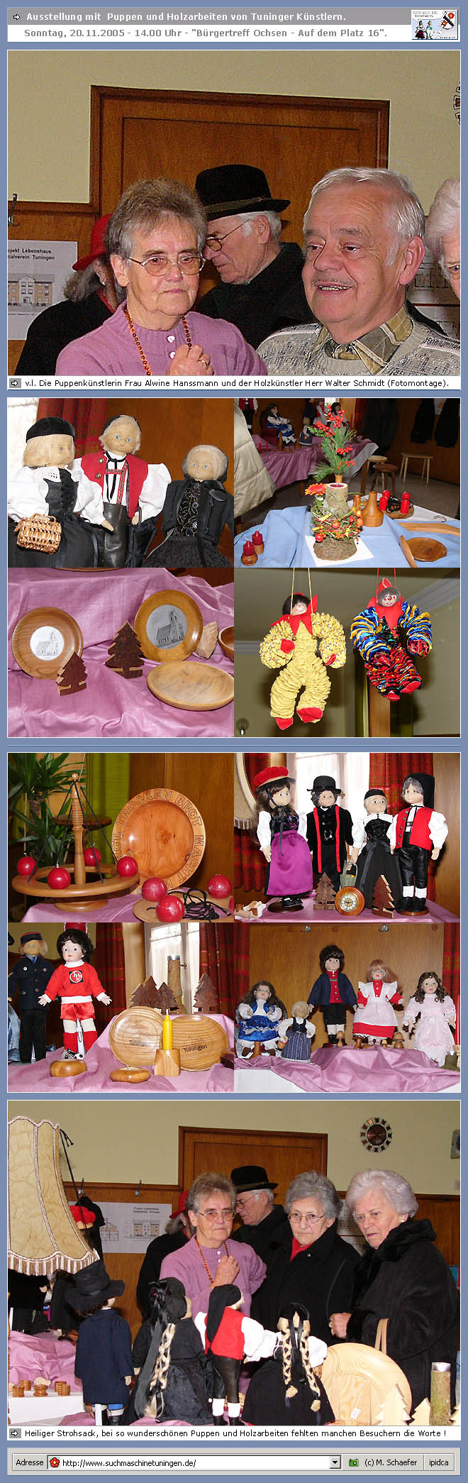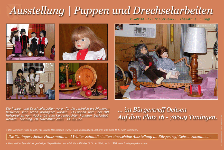 Wieder fand eine interessante Ausstellung mit schönen Sachen im Bürgertreff Ochsen statt. Die Tuninger Alwine Hanssmann und Walter Schmidt stellten eine schöne Ausstellung im Bürgertreff Ochsen - Auf dem Platz 16 zusammen. Die Puppen und Drechselarbeiten waren für die zahlreich erschienenen Besucher sehr schön arrangiert worden. 21 Puppen und über 100 Holzarbeiten vom Hocker bis zum Kerzenleuchter konnten besichtigt werden. Das Tuninger Multi-Talent Frau Alwine Hanssmann wurde 1928 in [Rötenberg], geboren und kam 1947 nach Tuningen (Luftlinie zu Tuningen 33km). Die Vorbilder entdeckt die talentierte Tuningerin nicht aus der Fachliteratur, sondern aus eigenen Ideen. Für eine Puppe und deren Accessoires ist sie mindestens 2 Wochen beschäftigt. Keine Puppe gleicht der anderen - Jede Puppe ist ein echtes Alwine Hanssmann Unikat.