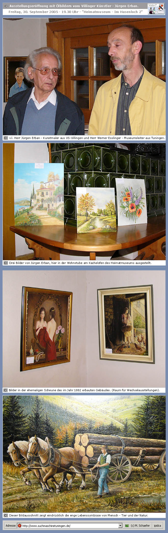 Nach der Sommerpause, beginnt mit der Bilderausstellung von Jürgen Erban die neue Ausstellungssaison des Heimatvereins Tuningen im Heimatmuseum. Sehr geehrte Damen und Herren, werte Gäste - Mit diesen Worten eröffnete Herr Esslinger die Ausstellung und stellte anschließend den bisherigen Lebensweg des 73jährigen Künstlers dar. Herr Erban ist gebürtiger [Danziger], ist dann aber nach Schleswig (Holstein) geflüchtet um wiederrum nach Rottweil umgesiedelt zu werden. Später ist er dann nach Villingen umgezogen. Hansestadt Danzig Herr Erban malt naturalistische Landschafts- und Blumenbilder und herrliche Tierbilder sowie Porträts in Öl, vereinzelt auch in Aquarelltechnik. Sein erstes Bild malte Herr Erban bereits mit 12 Jahren. Bei seiner Lehrzeit als Maler im Stadttheater Schleswig lernte er beim Bühnenmaler Wilhelm Lau die Kulissenmalerei kennen.