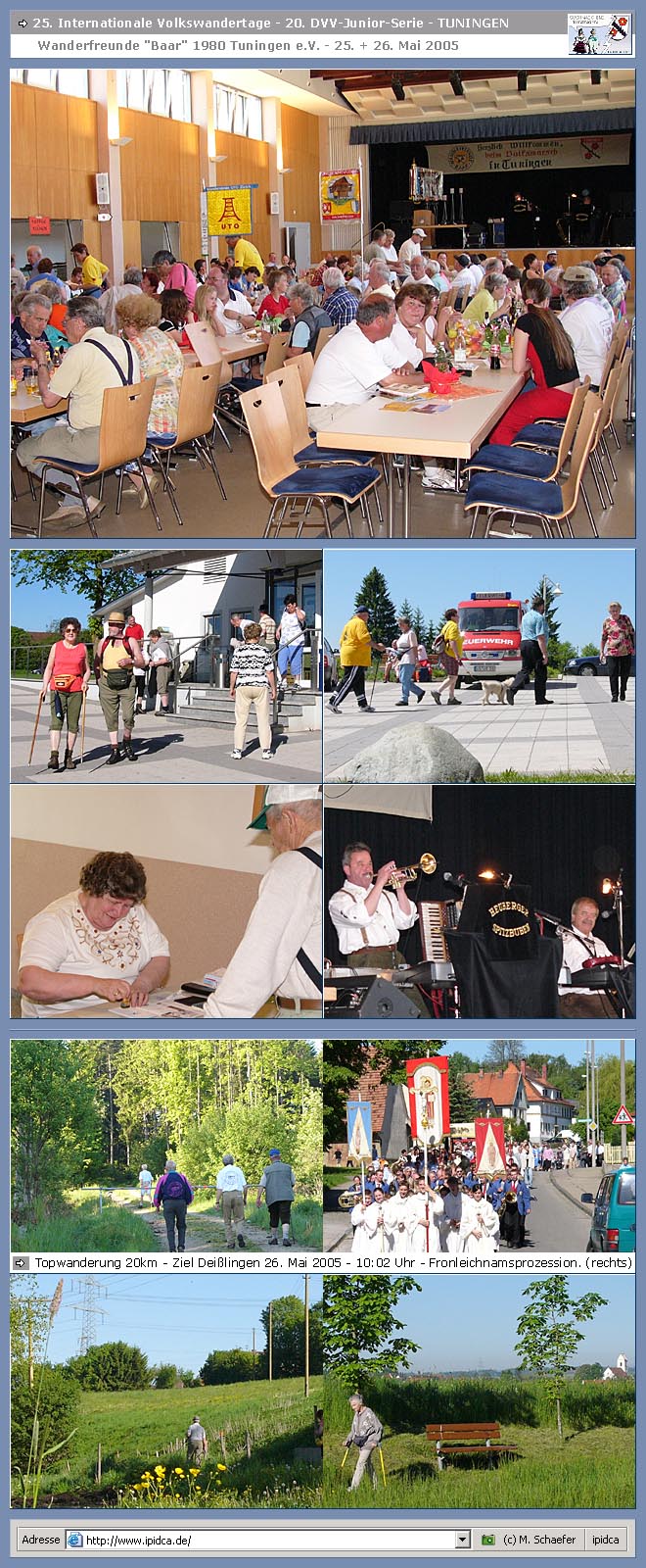Ausgangspunkt für die 25. Internationalen Volkswandertage und der integrierten Jugendwanderung (20. [DVV]-Junior-Serie) war die Festhalle in Tuningen. Bereits vor 07.00 Uhr und bei einer Temperatur von 10.1° marschierten die ersten Wanderer rund um Tuningen auf einer Höhe von ca. 749m über NN im Schwarzwald-Baar-Kreis. Viele Wanderer aus nah und fern konnten auf Schusters Rappen und bei schönem Wetter (12:00 Uhr - 23.2°) eine wunderbare Sicht auf unsere Baar genießen. Vorbei an Wald, Feld und Flur konnten die Naturfreunde Tuningen und seine Umgebung sehen und erleben.