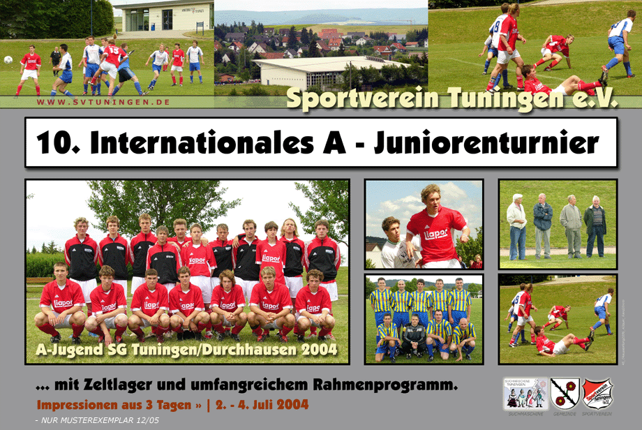 Der Sportverein Tuningen 1920 führte sein 11tes A-Junioren Fußballturnier mit Zeltlager und umfangreichem Rahmenprogramm durch. Der Turniersieger 2005 war der SC Fürstenfeldbruck aus Bayern. 18 Teams mit 301 jungen Sportlern waren in Tuningen am Start. Am Freitag, dem 1. Juli 2005 bezogen die Mannschaften bis 21.00 Uhr ihre vom SVT-Tuningen bereitgestellten Zelte. Die Püttlinger Mannschaft aus dem Saarland kamen als Letzte in Tuningen angereist. Dann ging es auch sofort in die Festhalle zur Get-Together-Party wo Horst Bury der 1. Vorsitzende des SV Tuningen die Auftritte der Jazz-Tanz-Gruppen aus dem Brigachtal und Tuningen ankündigte. Danach moderierte der Organisator Axel Schweizer die Teamvorstellung, wobei alle Mannschaften auf die Bühne kamen und sagen mussten warum Sie in Tuningen gewinnen. Viertelfinale um 12:30 Uhr - FC Albstadt - SC Fürstenfeldbruck 0:0 mit (EMS) 7:8, SC Gaissach - SS Brumath 3:0. Viertelfinale um 13:02 Uhr - SG Tuningen - VfL Pfullingen 2:0, TV Unterboihingen - SF Schwendi 1:1 beim (EMS) 4:5. Erstes Einlagespiel um 13:30 Uhr mit den Gemeinderäten gegen Vereinsvorstände mit Ergebniss 3:3. SG Tuningen - SF Schwendi 1:1 (EMS) 3:5, SC Gaissach - SC Fürstenfeldbruck 1:1 (EMS) 6:7. Endspiel 15:00 Uhr SF Schwendi - SC Fürstenfeldbruck 0:2 Siegerehrung um 15:40 Uhr - Endspielteilnehmer 1. Platz SC Fürstenfeldbruck, 2. Platz SF Schwendi. Halbfinaleteilnehmer 3. Platz SC Gaissach, 4. Platz SG Tuningen/Durchhausen. Viertelfinaleteilnehmer 5. Platz TV Unterboihingen, 6. Platz FC 07 Albstadt, 7. VfL Pfullingen, 8. SS Brumath. Die Verpflegung der Teams, Betreuer und Gäste erfolgte zentral, auf dem Hartplatz aufgestellten Festzelt, mit Frühstück, Mittagessen und Abendessen. ...