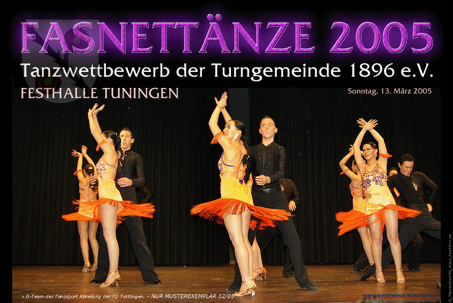 Abwechslungsreiches und buntes Showtanzprogramm mit 19 Gruppen in der Tuninger Festhalle. Nach der [Startauslosung] wurde um 12.30 Uhr im Wechsel gestartet (Kinder-Jugend-Kinder ...). - Die Mitorganisatorin [Barbara Gruler] moderierte die Sonntagmittag-Tanzsportveranstaltung. 7 närrische Tanzgruppen der Kategorie Kinder (13-) und 12 Gruppen in der Kategorie Jugendliche (18-) probten, schneidern und nähten wochenlang um dem Publikum und der Jury ihr Können und ihre Freude am Tanzen zeigen zu können. Jede Gruppe stellte einen Punktrichter (Notenskala 1-10 in 0.5er Schritten), wobei folgendes Ergebnis erfolgte.