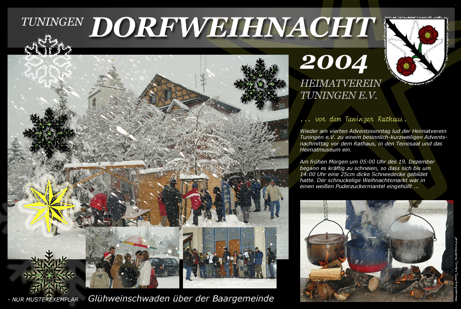 Wieder am vierten Adventssonntag lud der Heimatverein Tuningen e.V. zu einem besinnlich-kurzweiligen Adventsnachmittag vor dem Rathaus, in den Teinosaal und das Heimatmuseum ein. Es weihnachtete im weiß verzauberten Tuningen, dieses Erlebnis konnte bei der Dorfweihnacht vor dem Rathaus eindrucksvoll miterlebt werden. Gemeinsam mit je einem zusätzlichen Stand der Grund- und Hauptschule Tuningen mit Bastelarbeiten und des Förderverein Kinderheim Belovodskoje Tuningen mit Essen und Süßigkeiten und einem Verkaufstisch im Jugendtreff Hasen mit Schmuck aus Perlen wurde das Angebot abgerundet. Bei Glühwein vom offenen Feuer, Kessel- oder Grillwürsten, Kinderpunsch, Kaffee und Kuchen konnte man es sich gut gehen lassen. Wie schon die Jahre zuvor erfreute Herr Wilhelm Stöffler mit seinem Leierkasten die Gäste im Teinosaal. Das Museum war geöffnet und der Nikolaus kam um 16.15 und beschenkte die Kinder.