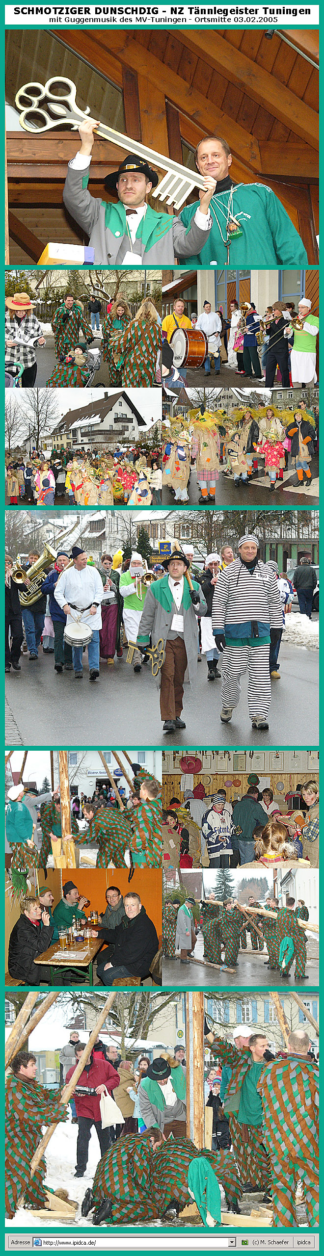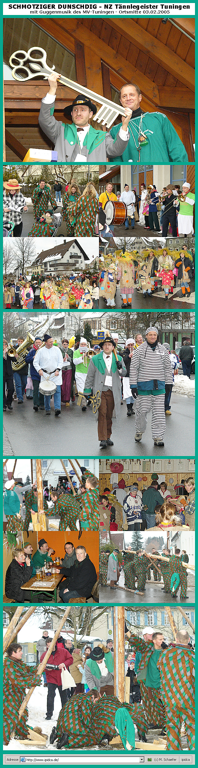 Die [Tännlegeister] holten die Kinder vom Fasnetball der TG-Tuningen ab und versammelten sich auf dem Rathausvorplatz. Der Zunftmeister Uwe Bioni forderte mit Unterstützung der lautstarken Tännlegeister den Rathausschlüssel vom [Schultes]. Rück den Schlüssel raus, rück den Schlüssel raus, aber Bürgermeister Roth wiedersetzte sich mit den Worten Kann ich ned macha. Nach langem hin und her übergab er dann unter lautstarkem Jubel der Närrinnen und Narren und mit Unterstützung der Guggenmusik des Musikverein-Tuningen, den Schlüssel dem Zunftmeister. Eingestellt am 03.02.2005 um 19:11 Uhr