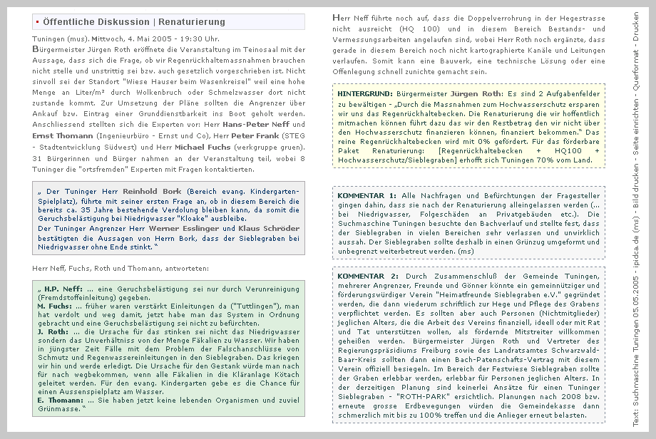 Herr Neff, Fuchs, Roth und Thomann, antworteten:Der Tuninger Angrenzer Herr Werner Esslinger und Klaus Schröder bestätigten die Aussagen von Herrn Bork, dass der Sieblegraben bei Niedrigwasser ohne Ende stinkt.