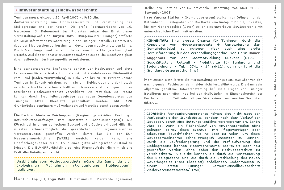 Auftaktveranstaltung zum Hochwasserschutz und Renaturierung des Sieblegrabens und der Kötach. Die große Podiumspräsenz von 10. Vertretern (5. Referenten) des Projektes zeigte den Ernst dieser Veranstaltung auf: Herr Jürgen Roth - (Bürgermeister Tuningen) eröffnete die Bürgerinformationsveranstaltung in der Tuninger Festhalle. Er erörterte, dass der Sieblegraben bei bestimmten Wetterlagen massiv ansteigen könne. Durch Verdolungen und Kantenprofile sei eine hohe Fließgeschwindigkeit erreicht. Ziel dieser Renaturierungsmassnahmen sei es, die Geschwindigkeit durch aufbrechen der Kantenprofile zu reduzieren.