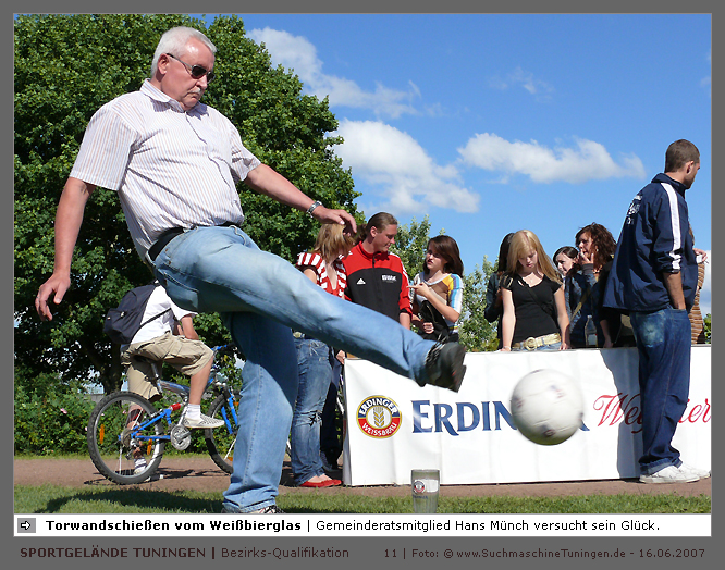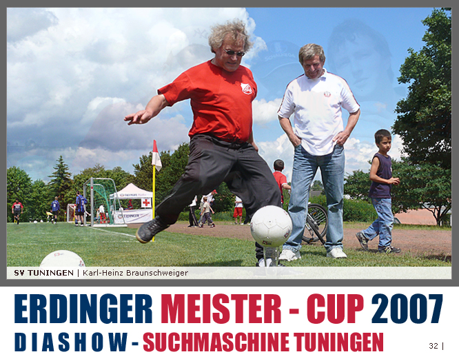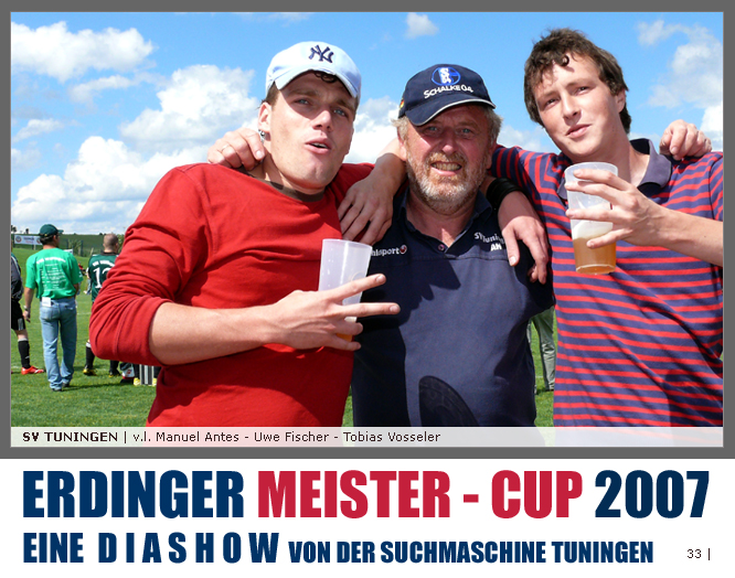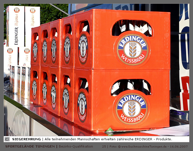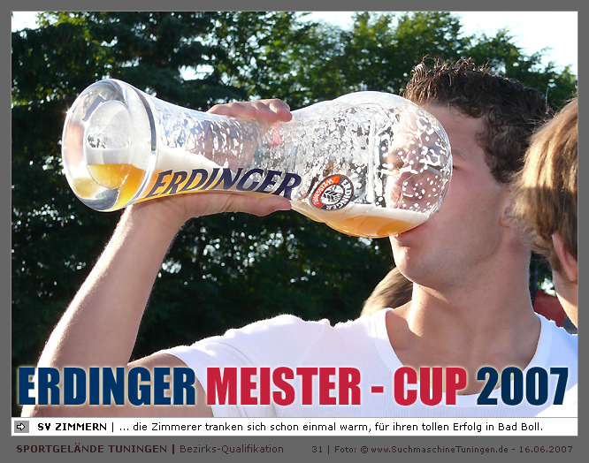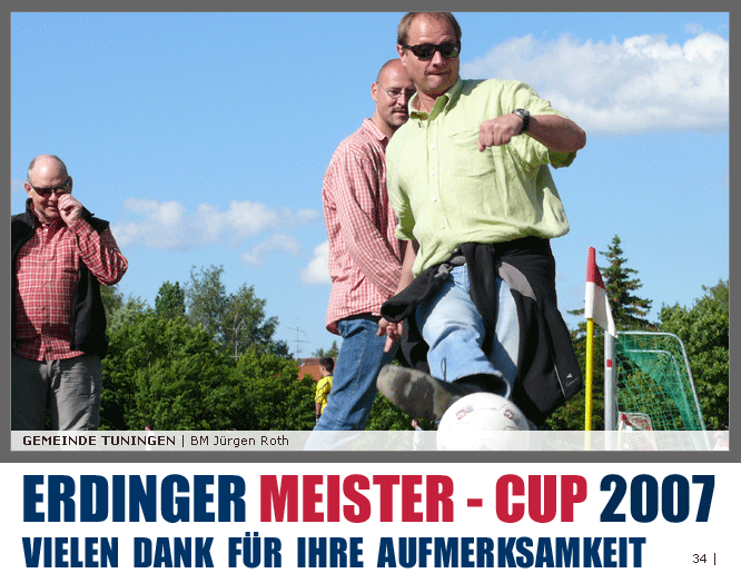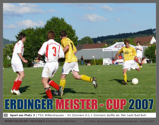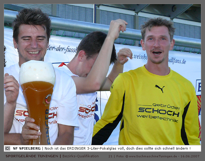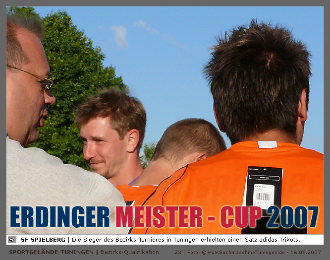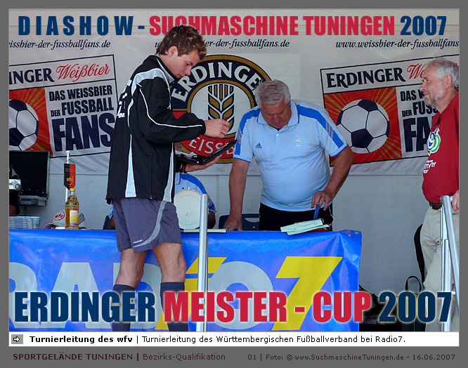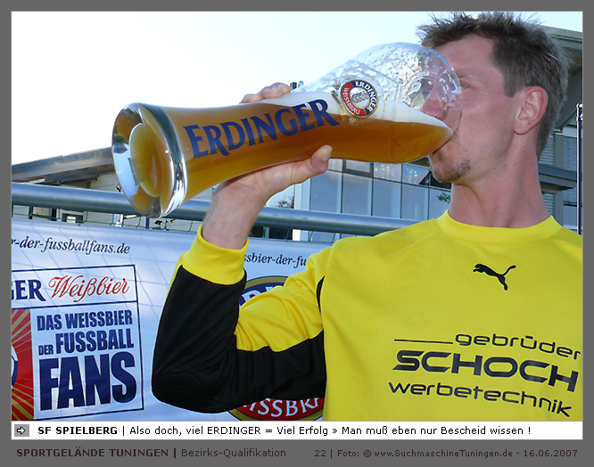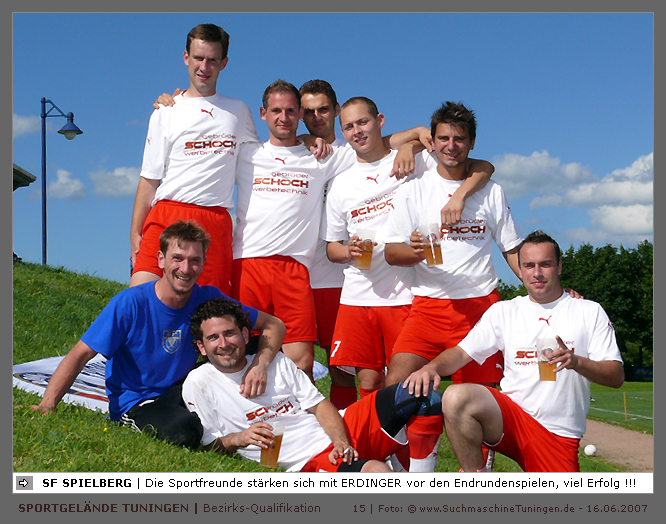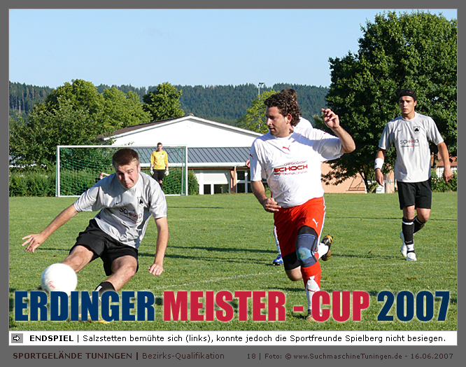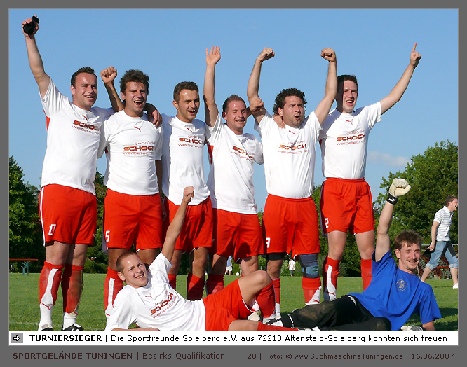 Deutschlands größtes Amateur-Fußballturnier ! Tuningen (mus). Samstag, 16. Juni 2007 - 13:00 Uhr. Der im Jahre 1975 von Altensteig eingemeinde Ort Spielberg mit 1265 Einwohnern (72213 Altensteig-Spielberg), hat mit seiner Fussballabteilung, den Sportfreunden Spielberg e.V., das Turnier in Tuningen gewonnen. Sie sind auch Meister 2006/07 der Spielklasse/Kreisligen B im Bezirk Böblingen/Calw (Kreisliga B, Staffel I). Auch der Finalist, die Sportfreunde Salzstetten (Kreisliga A, Nördlicher Schwarzwald) und der Bezirksligameister SV Zimmern (Bezirk Schwarzwald) hat sich für das Landesfinale in Bad Boll qualifiziert. » Privatbrauerei Erdinger Weißbräu lud ein » Direkt nach dem Saisonende lud die weltgrößte Weißbierbrauerei, die Privatbrauerei Erdinger Weißbräu (Werner Brombach GmbH), der Württembergische Fußballverband (wfv) und die ausrichtenden Vereine an vier Bezirks-Qualifikation-Austragungsorten zum ERDINGER Meister-Cup 2007 ein, der erstmalig auch in Baden-Württemberg ausgetragen wurde. Alle 155 Meister der Aktiven aus 16 Bezirken von der Kreisliga C bis zur Oberliga wurden vom WFV-Präsident Herbert Rösch zum Kräfte messen eingeladen, um auf dem Kleinfeld den "Meister der Meister" zu ermitteln, leider nahmen viele Teams diese Möglichkeit nicht wahr. Werbung von ERDINGER vor dem Turnier in Tuningen in Form von Flyern oder Programmheften, wie sie der SV Tuningen bei seinem Internationalen A Juniorenturnieren immer an die Haushalte verteilte oder große Transparente im Ort waren nicht gegeben, so war die Zuschauerresonanz nicht ausreichend. » Grossartige Kulisse auf dem SVT Sportgelände » Auf dem Sportgelände selbst, stimmte die Kulisse, wie Harald Maier Webbeauftragter des SV Tuningen stolz betonte. Die Bezirksvorrunden fanden am Samstag, 16. Juni 2007 in 73550 Waldstetten (Turniersieger: KF Kosova Bernhausen) und in 78609 Tuningen (Turniersieger: SF Spielberg) statt. In Tuningen (Schwarzwald-Baar Kreis - 2861 Einwohner - 743 m ü. NN), für die Meister der Bezirke Alb, Böblingen/Calw, Nördlicher Schwarzwald und Schwarzwald. Am Sonntag, 17. Juni 2007 in 74589 Gröningen-Satteldorf (Turniersieger: TURA Untermünkheim) und in 88447 Warthausen (Turniersieger: FV Neufra). Am Samstag, 23. Juni 2007 fand das Landesfinale für Württemberg in 73083 Bad Boll (Landkreis Göppingen - 7270 Einwohner - 427 m ü. NN) für die bestplatzierten Mannschaften aus den Vorrundenturnieren statt. (Gesamtsieger in Bad Boll wurde der SV Zimmern). » Sportverein Tuningen bestens gerüstet » Der Sportverein Tuningen freute sich auf ein tolles und faires Turnier, den teilnehmenden Mannschaften den erhofften Erfolg und den Zuschauern viel Spaß bei Musik und Action. Die Mannschaften und Besucher wurden durch Bombenwetter in Tuningen begrüßt. Am Vortag beim Aufbau des zahlreichen Equipments regnete es. Am Samstag, 16. Juni 2007 wurden in Tuningen auf dem Sportgelände des SV Tuningen in der Talstrasse von 13.00 bis 18:50 Uhr auf 2 Spielfeldern (Normalspielfeld quer mit 5m x 2m Tor) mit je 5 Feldspielern und 1 Torwart je 10 Minuten lang die Vorrundenspiele mit folgenden 12 Mannschaften bestritten. » Teilnehmer der Vorrunde in Tuningen » Gruppe A: TSV Undingen (Meister Kreisliga A 1, Bezirk Alb) SF Salzstetten (Kreisliga A 2, nördlicher Schwarzwald) TSV Gunningen (Kreisliga C 3, Schwarzwald) Türkischer SV Schramberg (Kreisliga C 1, Schwarzwald) VfR Wilflingen (Kreisliga B 1, Schwarzwald) SF Spielberg (Kreisliga B 1, Böblingen/Calw) Gruppe B: SV Beffendorf (Kreisliga A 1, Schwarzwald) SV Zimmern (Bezirksliga, Schwarzwald) SV Winzeln (Kreisliga C 2, Schwarzwald) SV Bubsheim (Kreisliga B 2, Schwarzwald) TSG Wittershausen (Kreisliga B 2, nördlicher Schwarzwald) Spvgg. Aldingen (Kreisliga A 2, Schwarzwald). » Spannende Endrunde in Tuningen » Von 17:15 - 18:50 fand die Endrunde in Tuningen mit folgenden Ergebnissen statt. Halbfinale: TSG Wittershausen - SF Spielberg 0:2 Halbfinale: SF Salzstetten - SV Zimmern 1:0 Spiel um Platz 3: Wittershausen - SV Zimmern 0:1 Endspiel: SF Salzstetten - SF Spielberg 1:2 Endplazierungen: 1. SF Spielberg (Kreisliga B 1, Böblingen/Calw) 2. SF Salzstetten (Kreisliga A 2, nördlicher Schwarzwald) 3. SV Zimmern (Bezirksliga, Schwarzwald) 4. TSG Wittershausen (Kreisliga B 2, nördlicher Schwarzwald) » SVT - Exzellente Bewirtung und Spieler(innen) » Für die Bewirtung mit Speisen und Getränke, sowie Kaffee und Kuchen wurde durch zahlreichen Helfer des SV Tuningen unter dem Vorsitz von Horst Bury und seinem Festwirt und Organisationsleiter Norbert Kutscher gesorgt. Bürgermeister Jürgen Roth, die Freiwillige Feuerwehr Tuningen (Parkplatzeinweisung) und der Bereitschaftsdienst des DRK Tuningen rundeten das Gesamthelferteam ab. Beim Torwandschießen vom Weißbierglas konnte die Fußballspielerin Johanna Fischer von den B-Juniorinnen Verbandstaffel Süd - SV Tuningen, vor Manuel Antes, Spieler der 1. Mannschaft des SV Tuningen (Herren Kreisliga A Bezirk Schwarzwald Staffel II) und Stefan Förnbacher B-Jugend, von der SG Tuningen/Durchhausen, brillieren. » ERDINGER Groundhopping-Bus mit Zapfanlage » Im ERDINGER Groundhopping-Bus mit Zapfanlage, Mini-Küche und Flatscreens konnte vorn oder hinten in der gemütlichen Sitzecke mit Tischen mit einem kühlen Getränk Platz genommen werden. Da außen am Bus Zapfhähne angebracht waren, konnte auch vor dem Bus an einer Stehtheke bei Edmund Büg und Heidi Pfander von Erdinger Promotion ein Bier getrunken werden, wobei sich die meißten Besucher aber an einem separaten Bierstand von ERDINGER neben Radio 7 (Radio 7 war mit Redakteur Michael Mader vor Ort) Bier oder beim Sportverein ein Getränk und Speisen holten um auf dem Hartplatz, der mit Brauereitischen- und bänken bestückt war, den spannenden kurzweiligen Spielen zuzuschauen, die vom wfv Verbandsliga-Schiedsrichter Benjamin Butz und den wfv Landesliga-Schiedsrichtern Ralf Fechter, Norbert Hellstern, Adam Waleczko, Richard Fridrich und Philipp Lehmann hervorrag