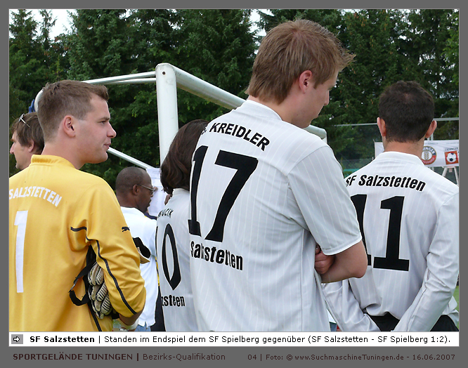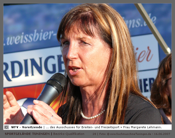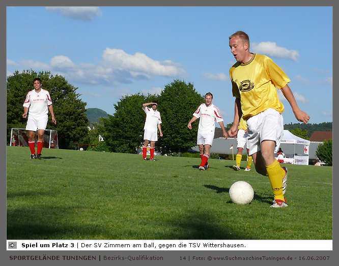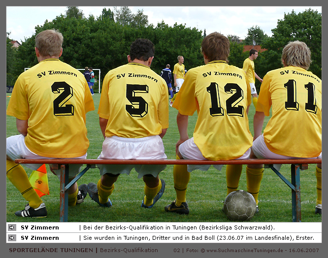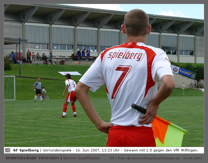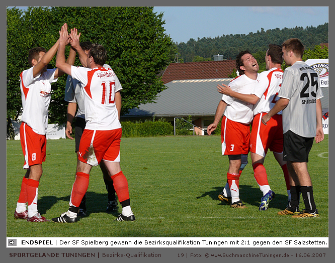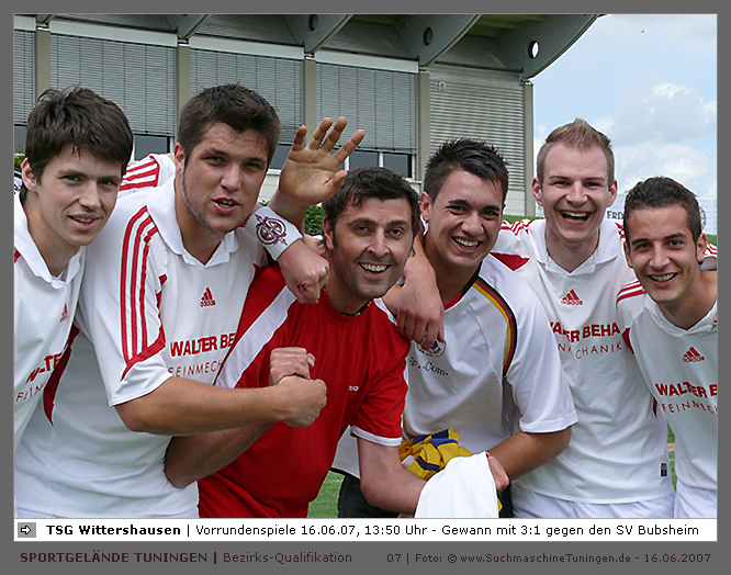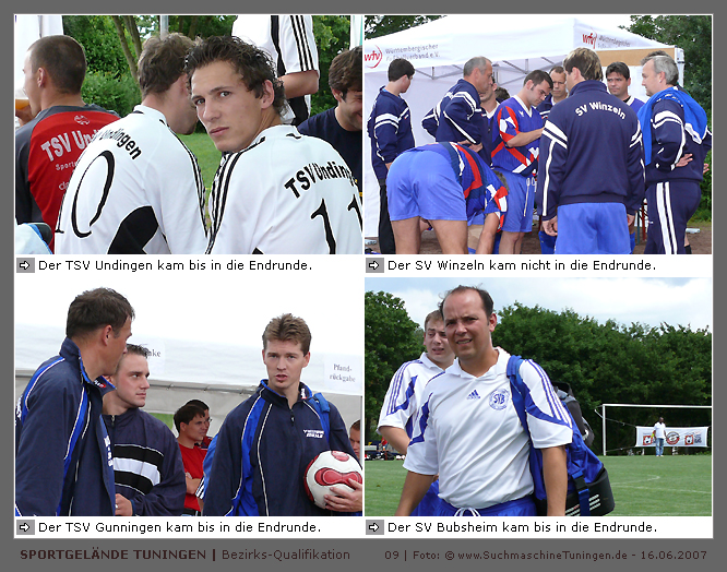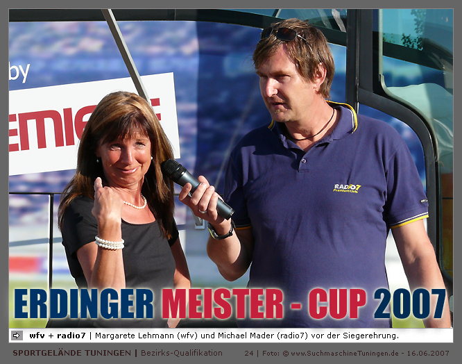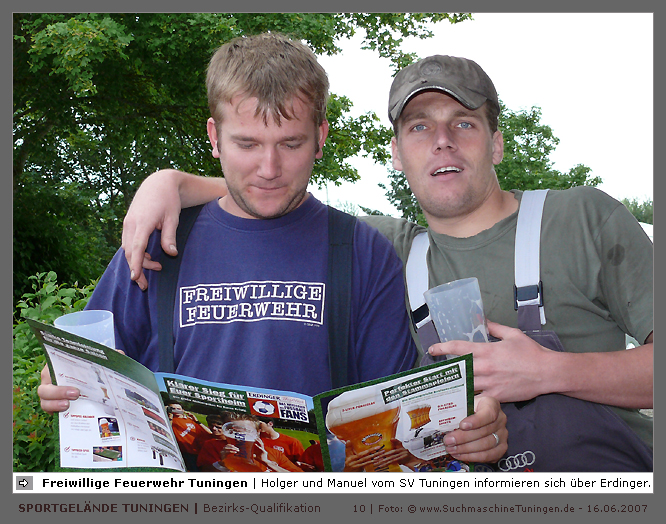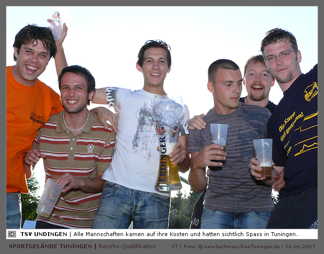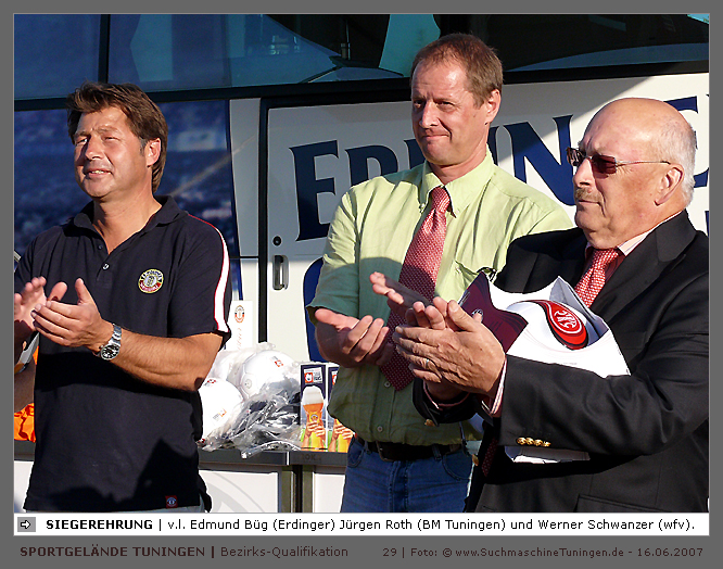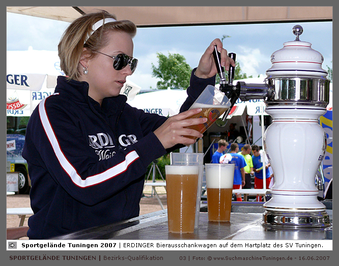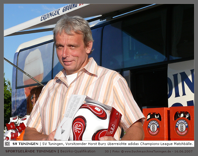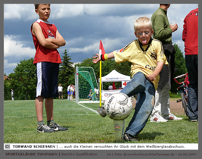 Deutschlands größtes Amateur-Fußballturnier ! Tuningen (mus). Samstag, 16. Juni 2007 - 13:00 Uhr. Der im Jahre 1975 von Altensteig eingemeinde Ort Spielberg mit 1265 Einwohnern (72213 Altensteig-Spielberg), hat mit seiner Fussballabteilung, den Sportfreunden Spielberg e.V., das Turnier in Tuningen gewonnen. Sie sind auch Meister 2006/07 der Spielklasse/Kreisligen B im Bezirk Böblingen/Calw (Kreisliga B, Staffel I). Auch der Finalist, die Sportfreunde Salzstetten (Kreisliga A, Nördlicher Schwarzwald) und der Bezirksligameister SV Zimmern (Bezirk Schwarzwald) hat sich für das Landesfinale in Bad Boll qualifiziert. » Privatbrauerei Erdinger Weißbräu lud ein » Direkt nach dem Saisonende lud die weltgrößte Weißbierbrauerei, die Privatbrauerei Erdinger Weißbräu (Werner Brombach GmbH), der Württembergische Fußballverband (wfv) und die ausrichtenden Vereine an vier Bezirks-Qualifikation-Austragungsorten zum ERDINGER Meister-Cup 2007 ein, der erstmalig auch in Baden-Württemberg ausgetragen wurde. Alle 155 Meister der Aktiven aus 16 Bezirken von der Kreisliga C bis zur Oberliga wurden vom WFV-Präsident Herbert Rösch zum Kräfte messen eingeladen, um auf dem Kleinfeld den "Meister der Meister" zu ermitteln, leider nahmen viele Teams diese Möglichkeit nicht wahr. Werbung von ERDINGER vor dem Turnier in Tuningen in Form von Flyern oder Programmheften, wie sie der SV Tuningen bei seinem Internationalen A Juniorenturnieren immer an die Haushalte verteilte oder große Transparente im Ort waren nicht gegeben, so war die Zuschauerresonanz nicht ausreichend. » Grossartige Kulisse auf dem SVT Sportgelände » Auf dem Sportgelände selbst, stimmte die Kulisse, wie Harald Maier Webbeauftragter des SV Tuningen stolz betonte. Die Bezirksvorrunden fanden am Samstag, 16. Juni 2007 in 73550 Waldstetten (Turniersieger: KF Kosova Bernhausen) und in 78609 Tuningen (Turniersieger: SF Spielberg) statt. In Tuningen (Schwarzwald-Baar Kreis - 2861 Einwohner - 743 m ü. NN), für die Meister der Bezirke Alb, Böblingen/Calw, Nördlicher Schwarzwald und Schwarzwald. Am Sonntag, 17. Juni 2007 in 74589 Gröningen-Satteldorf (Turniersieger: TURA Untermünkheim) und in 88447 Warthausen (Turniersieger: FV Neufra). Am Samstag, 23. Juni 2007 fand das Landesfinale für Württemberg in 73083 Bad Boll (Landkreis Göppingen - 7270 Einwohner - 427 m ü. NN) für die bestplatzierten Mannschaften aus den Vorrundenturnieren statt. (Gesamtsieger in Bad Boll wurde der SV Zimmern). » Sportverein Tuningen bestens gerüstet » Der Sportverein Tuningen freute sich auf ein tolles und faires Turnier, den teilnehmenden Mannschaften den erhofften Erfolg und den Zuschauern viel Spaß bei Musik und Action. Die Mannschaften und Besucher wurden durch Bombenwetter in Tuningen begrüßt. Am Vortag beim Aufbau des zahlreichen Equipments regnete es. Am Samstag, 16. Juni 2007 wurden in Tuningen auf dem Sportgelände des SV Tuningen in der Talstrasse von 13.00 bis 18:50 Uhr auf 2 Spielfeldern (Normalspielfeld quer mit 5m x 2m Tor) mit je 5 Feldspielern und 1 Torwart je 10 Minuten lang die Vorrundenspiele mit folgenden 12 Mannschaften bestritten. » Teilnehmer der Vorrunde in Tuningen » Gruppe A: TSV Undingen (Meister Kreisliga A 1, Bezirk Alb) SF Salzstetten (Kreisliga A 2, nördlicher Schwarzwald) TSV Gunningen (Kreisliga C 3, Schwarzwald) Türkischer SV Schramberg (Kreisliga C 1, Schwarzwald) VfR Wilflingen (Kreisliga B 1, Schwarzwald) SF Spielberg (Kreisliga B 1, Böblingen/Calw) Gruppe B: SV Beffendorf (Kreisliga A 1, Schwarzwald) SV Zimmern (Bezirksliga, Schwarzwald) SV Winzeln (Kreisliga C 2, Schwarzwald) SV Bubsheim (Kreisliga B 2, Schwarzwald) TSG Wittershausen (Kreisliga B 2, nördlicher Schwarzwald) Spvgg. Aldingen (Kreisliga A 2, Schwarzwald). » Spannende Endrunde in Tuningen » Von 17:15 - 18:50 fand die Endrunde in Tuningen mit folgenden Ergebnissen statt. Halbfinale: TSG Wittershausen - SF Spielberg 0:2 Halbfinale: SF Salzstetten - SV Zimmern 1:0 Spiel um Platz 3: Wittershausen - SV Zimmern 0:1 Endspiel: SF Salzstetten - SF Spielberg 1:2 Endplazierungen: 1. SF Spielberg (Kreisliga B 1, Böblingen/Calw) 2. SF Salzstetten (Kreisliga A 2, nördlicher Schwarzwald) 3. SV Zimmern (Bezirksliga, Schwarzwald) 4. TSG Wittershausen (Kreisliga B 2, nördlicher Schwarzwald) » SVT - Exzellente Bewirtung und Spieler(innen) » Für die Bewirtung mit Speisen und Getränke, sowie Kaffee und Kuchen wurde durch zahlreichen Helfer des SV Tuningen unter dem Vorsitz von Horst Bury und seinem Festwirt und Organisationsleiter Norbert Kutscher gesorgt. Bürgermeister Jürgen Roth, die Freiwillige Feuerwehr Tuningen (Parkplatzeinweisung) und der Bereitschaftsdienst des DRK Tuningen rundeten das Gesamthelferteam ab. Beim Torwandschießen vom Weißbierglas konnte die Fußballspielerin Johanna Fischer von den B-Juniorinnen Verbandstaffel Süd - SV Tuningen, vor Manuel Antes, Spieler der 1. Mannschaft des SV Tuningen (Herren Kreisliga A Bezirk Schwarzwald Staffel II) und Stefan Förnbacher B-Jugend, von der SG Tuningen/Durchhausen, brillieren. » ERDINGER Groundhopping-Bus mit Zapfanlage » Im ERDINGER Groundhopping-Bus mit Zapfanlage, Mini-Küche und Flatscreens konnte vorn oder hinten in der gemütlichen Sitzecke mit Tischen mit einem kühlen Getränk Platz genommen werden. Da außen am Bus Zapfhähne angebracht waren, konnte auch vor dem Bus an einer Stehtheke bei Edmund Büg und Heidi Pfander von Erdinger Promotion ein Bier getrunken werden, wobei sich die meißten Besucher aber an einem separaten Bierstand von ERDINGER neben Radio 7 (Radio 7 war mit Redakteur Michael Mader vor Ort) Bier oder beim Sportverein ein Getränk und Speisen holten um auf dem Hartplatz, der mit Brauereitischen- und bänken bestückt war, den spannenden kurzweiligen Spielen zuzuschauen, die vom wfv Verbandsliga-Schiedsrichter Benjamin Butz und den wfv Landesliga-Schiedsrichtern Ralf Fechter, Norbert Hellstern, Adam Waleczko, Richard Fridrich und Philipp Lehmann hervorrag