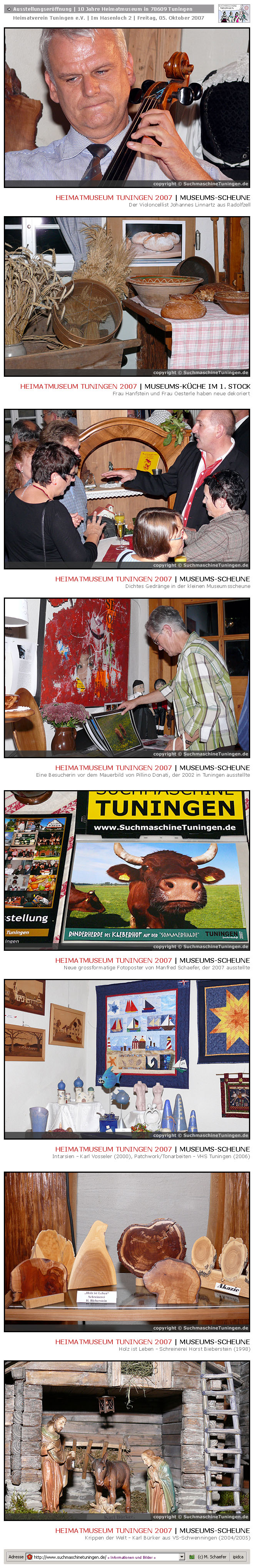 Das Heimatmuseum hat in den letzten 10 Jahren 30 verschiedene Ausstellungen und weitere andere Aktivitäten zu Wege gebracht, ein repräsentativer Querschnitt aus diesen Angeboten wurde heuer in der 31 Gemeinschaftsausstellung im Museum präsentiert. Werner Esslinger begrüßte die eingeladenen Ehrenmitglieder, Bürgermeister Jürgen Roth, Gemeinderatsmitglieder, Vertreter der 3 Tuninger Kirchen und eine Delegation aus unserer Partnerstadt Camogli, und hieß sie herzlich willkommen. Die Erfolgsgeschichte des 1985 gegründeten Verein mit dem damaligen Vorsitzenden Kuno Gaß (Zimmermeister) nahm mit dem Vorhaben, das baufällige Gebäude hinter dem Tuninger Rathaus als künftiges Heimatmuseum nutzen zu wollen große Fortschritte, auch wurde der fast eingeschlafene Verein durch diese Maßnahme wieder belebt. » Der Grundstein der Erfolgsgeschichte » Zum Gelingen des heutigen Museums, haben damals der Gemeinderat, der ehemalige Bürgermeister Walter Klumpp und freundliche Handwerker mit kleinen oder gar keinen Rechnungen beigetragen, so Werner Esslinger, der seit 1992 erster Vorstand des Heimatverein Tuningen e.V. ist. Auch wäre die Erfolgsgeschichte durch die Masse der Aussteller mit Tuninger Mitbürger/innen, die 16 schöne Ausstellungen zusammengetragen haben, nicht geschrieben worden. » Finanzierung gesichert, erste Arbeiten beginnen » Das Projekt Heimatmuseum hinter dem Tuninger Rathaus (Im Hasenloch 2) war lange Zeit sehr umstritten, doch konnte nach mühevollen Diskussionen und vielfältigen Entwürfen der damalige Gemeinderat und Bürgermeister Walter Klumpp vom Vorhaben des Heimatvereins überzeugt werden und die umfassende Sanierung, des vom Tagelöhner Johannes Kohler und dem Schneider Jakob Kaiser im Jahre 1883 erbauten Gebäudes, beginnen. Nach erfolgreichen Verhandlungen über die Finanzierung, konnte am 14. Februar 1995, der erste Arbeitseinsatz mit dem Abbruch des kompletten Nordgiebels (Rathausseite) bzw. des gesamten rechten Scheunenteils begonnen werden. » Neuaufbau und Einrichtung des Museum » Unter der Bauleitung des bereits verstorbenen Zimmermeisters, Herrn Kuno Gaß wurde 1996 der Scheunenteil neu aufgebaut, das Dach komplett erneuert und eine Dachgaube eingebaut und verschiedene An- und Umbauten gestaltet. Immer wieder gab es Diskussionen und grosser Verdruss machte sich breit, so Herr Esslinger, da viele Tage im Museum mit viel Arbeit für die Heimatmuseum'ler zu Ende gingen. Doch dann konnte auch der Innenausbau beginnen, wobei moderene Toiletten in den Keller und in das Erdgeschoss eine Einbauküche eingebaut wurden. Aus der Museumsidee und der Vision ein Heimatmuseum mit Schwerpunkt, das einfache Leben auf dem Land aufzuzeigen und festzuhalten, wurde ein reelles sehr schönes, wenn auch kleines Museum. » Treff vom BM und seinen politischen Gästen » Gerne würde das Museum auch für Gemeindebesuche von hohen Politikern genützt, so Herr Esslinger zu Herrn Roth rüberblickend. BM Jürgen Roth bestätigte dass und ließ wissen, das sich zum Beispiel der damalige Ministerpräsident unseres Landes Baden-Württemberg, Herr Erwin Teufel am 2. Februar 2002, (nach Rücksprache mit Erwin Teufel) sehr wohl in unserer Heimatstube neben dem beheizten Kachelofen (kuschelig warm) gefühlt hat. (Damals war noch Walter Klumpp BM von Tuningen, heute BM von Bad Dürrheim). Doch nun weiter zur Museumsgeschichte, ein Jahr später anlässlich der 1200-Jahr Feier der Gemeinde Tuningen wurde das damals 114-jährige Gebäude, seiner neuen Bestimmung übergeben und als Museum am 23. März 1997 feierlich eingeweiht. » Auftrag, das Museum mit Leben füllen » Der selbstgestellte Auftrag des Heimatvereins, das Museum mit Leben zu erfüllen und der Öffentlichkeit vorzustellen, war vorerst erfüllt. Doch bereits nach kurzer Zeit, ließ der einstige Besucherandrang nach, und so beschloss der Heimatverein, Veranstaltungen und Ausstellungen in den Wintermonaten anzubieten. Die erste Veranstaltung im Museum war die Vorstellung eines Kochbuches von der Tuningerin Frau Maria Hanfstein, gefolgt von einem Mundartabend von der Tuningerin Frau Klara Geiger. Mit genialen großen Fotos von unserem Weltall, eröffnete der Tuninger Dr. Kurt Becker (Do Doaninger Zahnarzt), 1998 die erfolgreiche Ausstellungsperiode und zeigte einen Einblick in sein Hobby und damit verbundenen Schaffen. In den darauf folgenden Jahren schufen zahlreiche Tuninger, aber auch Auswärtige ein Fest für die Augen und für die Sinne von Jung und Alt mit den verschiedensten Ausstellungen mit Astronomie, Alte Karten, Air-Brush-Bildern, Schmuck, Holz, Puppen, Ostereiern, Bildträumen, Kornsäcken, Intarsien, Bildern, Feuerwehr, Objekte aus Ton, Kirchenumbau, Bemannte Raumfahrt, Zimmermannskunst, Bibeln, Malerei, Skulpturen, Photoapparate, Krippen, Gemälde, Trachten, Stuck, Patchwork, Häkeln, Holzarbeiten und Tuninger-Fotos. » Viele Aktivitäten des Heimatverein Tuningen » 16 Ausstellungen wurden von Tuninger Bürgern gestaltet, 8000 Besucher fanden sich bis jetzt zu den verschiedenen Angeboten ein. Doch noch nicht genug, der HV Tuningen richtete 1999 auch ein Storchennest ein, das kurzeitig auch angenommen wird. 2002 wurde hinter dem Museum ein Backhäuschen errichtet, das von den Heimatverein-Frauen für das eigene Brot backen verwendet wird. Der Heimatverein Tuningen veranstaltete auch einen "Z'lied Obed" und nimmt jedes Jahr am Kinderferienprogramm teil, wobei das einstige Drachen bauen durch Brot backen ersetzt wurde. Der HV Tuningen veranstaltet für seine Mitglieder auch Sauerkrautessen und ist beim alljährlichen Sommerfest und der Dorfweihnacht ein gern gesehener Gastgeber. Ergänzt wird das Angebot durch Vorträge und Diavorträge. BM Jürgen Roth hob hervor, dass Ehrenamtliche das Museum für uns aufgebaut und gestaltet haben und die Hausbesitzerin keinerlei Kosten mit Strom, Gas oder Wasser hat. Die musikalische Umrahmung, bei dem Jubiläumstreffen in der Scheune wurde vom Violoncellisten, dem Lehrer Johannes L