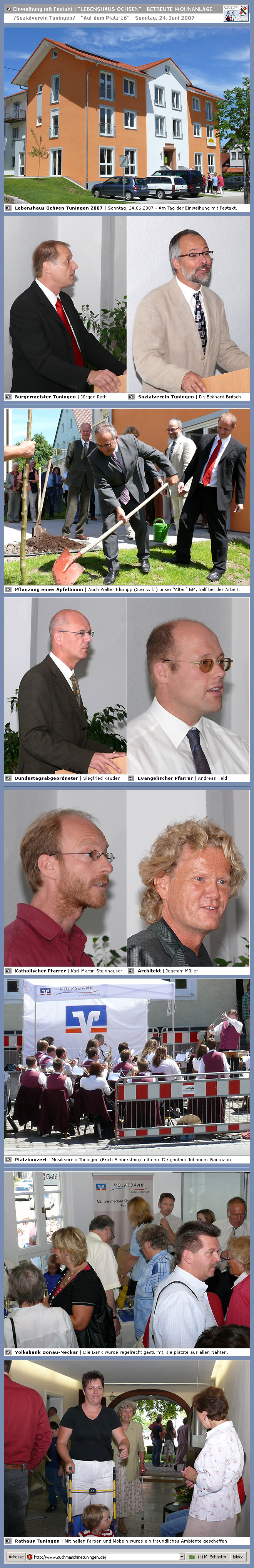 Nach einem Musikstück des Trompetenensemble des Musikverein Tuningen, begrüßte Bürgermeister Jürgen Roth das Mitglied des Deutschen Bundestages, Herrn Siegfried Kauder (Villingen-Schwenningen CDU/CSU) und die zahlreichen Ehrengäste und Mitbürger-/innen, im Namen der Gemeinde. In der Zeit, Mitte des 19. Jahrhunderts ging man am Sonntag Morgen nach der Kirche in den Ochsen, wo der blaue Kachelofen in der Gaststube bollerte und selbstgebrautes Bier getrunken wurde, so BM Roth. Man trifft sich immer wieder am Sonntag im Ochsen und tauscht sich aus, so auch heute. Es ist geschafft, ein neuer Ochsen ist mitten im Ort auf dem alten Gewölbekeller gebaut worden, und bleibt ein zentrales Gebäude mit kurzen Einkaufswegen. Man könne alles sehen, beobachten und in Pantoffeln zum Lebensmittler, Friseur oder zur Apotheke gehen. » Rathaus und Volksbank Umbau fertiggestellt » Das Rathaus und die Volksbank-Donau-Neckar eG luden die Tuninger Bevölkerung an diesem Tag nach umfangreichen Sanierungs,- und Erneuerungsmaßnahmen zu einem Tag der offenen Tür ein, wobei der Musikverein Tuningen vor der Volksbank ein Platzkonzert gab. (Der behindertengerechte Zugang des Rathauses und der Volksbank werden 2007 fertiggestellt). In die Idee des Lebenshaus in Tuningen / Schwarzwald-Baar-Kreis sei viel Herzblut investiert und eigens ein Verein (Sozialverein Tuningen) gegründet und viele Besichtigungen getätigt worden. Dabei wurde das Konzept "Alt werden in Tuningen" aus Ettenheim übernommen. Im Zentrum von Ettenheim befinden sich zwei Häuser, das alte St. Josefshaus und die alte ehemalige Winterschule, in der die Idee des Betreuten Wohnens bereits seit 20 Jahren praktiziert wird. » Weiterer Mehrzwecksaal für die Gemeinde » Der neue Mehrzwecksaal der Gemeinde Tuningen im Ochsen ist nicht nur für die Gemeinderatssitzungen, sondern auch für Wahlen der Gemeinde, für die Hockergymnastik und den Bürgertreff des Sozialverein Tuningen. Besonders hervorgehoben Hat Herr Roth, das Engagement von Herbert Hauser, Rosi Bippus und Dr. Eckhard Britsch. » Sozialverein Vorsitzender - Dr. Eckhard Britsch » Nun begrüßte Dr. Eckhard Britsch die Bewohner des Lebenshauses, einen der Geschäftsführer der SWR GmbH - Büro für Bauleitung und Projektsteuerung - Walter Rombach und Vertreter des Seniorenwohnhaus St. Josefhaus - Betreutes Wohnen in 77955 Ettenheim. Herr Britsch, gedenkte auch Maria Barrho (Auf dem Platz 17) die mit dem Projekt sehr verbunden war und den ganzen Abbruch und den Baulärm miterlebt hatte, aber leider nicht mehr einziehen konnte. Er dankte allen Beteiligten für das große Engagement. Wenn Tuninger Bürger in der nächsten Zeit, das Angebot des Betreuten Wohnens nicht in Anspruch nehmen wollen, so wird die Konzeption geändert. Wenn es die Tuninger nicht wollen, so dürfen andere hier den herrlichen Blick über den Platz geniessen und die Betreuung des Sozialverein Tuningen in Anspruch nehmen, so Herr Britsch. » Sprecher für alle 3 Kirchen, Herr Heid » Pfarrer Andreas Heid von der evangelischen Kirchengemeinde Tuningen gratulierte zu diesem baulichen Schmuckstück und Farbtupfer in der Gemeinde Tuningen. Es sei einen mutiges und richtungsentscheidendes Objekt für ältere Senioren/-innen in der Mitte des Orts entstanden. Ein Miteinander der Generationen, sich zu achten und jeden vom Schöpfer als einzigartiges Original zu sehen, sei wichtig. Träume wurden wahr, Ideen, Papiere wurden Materie Stein und Leben. Er beschloss seine Worte mit einem Segenswunsch, mit dem Glauben an den guten Schöpfer und das in uns Neues entsteht. Er überreichte Herrn Britsch vom Sozialverein eine Bibel zum Einzug. Vikar Karl-Martin Steinhauser von der katholischen Kirchenvertretung überreichte Herrn Britsch als Einzugsgeschenk zwei kleine Bilder. » Siegfried Kauder, CDU-Bundestagsabgeordneter » Nun begab sich Siegfried Kauder, CDU-Bundestagsabgeordneter, an das Rednerpult. Die Gemeinde feiert und nimmt an diesen Feierlichkeiten in grossem Umfang teil, so stellen wir uns Politik vor, Projekte wie dieses Lebenshaus haben Zukunft, da die Bevölkerung in Deutschland unumkehrlich älter werde. Ältere Menschen werden nicht wie ein alter Baum umgepflanzt, wenn sie pflegebedürftigt werden, sondern können in der Gemeinde bleiben, so MdB (2002) und Vorsitzender des CDU-Kreisverbandes im Schwarzwald-Baar-Kreis, Siegfried Kauder. Andere Kommunen haben es vorgemacht und warum soll es in Tuningen nicht funktionieren. Ältere Menschen brauchen medizinische Pflege, Betreuung und menschliche Zuwendung. Herr Siegfried Kauder (56) gratulierte den Tuninger/-innen und dem Sozialverein für das wunderschöne Haus und wünschte allen einen schönen Tag und viel Spass mit dem Lebenshaus Ochsen. » Architekt Joachim Müller aus Villingen » Zum Schluss wandte sich der Architekt Joachim Müller an die Festgemeinde. Es sei kein normaler Weg gewesen, dass ein wirklich kleiner sozial engagierter Verein, die schwierige Bauaufgabe und Motivation geschultert hat. Auch seien die ersten Entwürfe (eines neuen Ochsen) nicht gleich akzeptiert worden, aber er habe sich zum Guten belehren lassen. Der Sozialverein habe mit seinem Mitgliedern bis zur Fertigstellung des Gebäudes immer wieder Bewegung in das Projekt hineingebracht. Bevor es zur gemeinsamen Pflanzung eines Baumes ging, dankte BM Roth dem ehemaligen Bürgermeister aus Tuningen Walter Klumpp, der nun BM in Bad Dürrheim ist, für die Idee vor 8 Jahren mit dem betreuten Wohnen. Nach alter Tradition pflanzte nun BM Jürgen Roth und Herr Eckhard Britsch zusammen mit den Ehrengästen einen vom Obst- und Gartenbauverein (Karl Bippus) gespendeten Apfelbaum. » Platzkonzert des Musikverein Tuningen » Danach ging es gemeinsam zur Rathausbesichtigung, zur Neueröffnung der Volksbank, zum Platzkonzert des Musikverein Tuningen und wieder zurück in das "Lebenshaus Ochsen" zum Mittag essen. Bei der Bewirtung durch den Sozialverein Tuningen gab es Maultaschen mit Kartoffelsalat, Rote Würs
