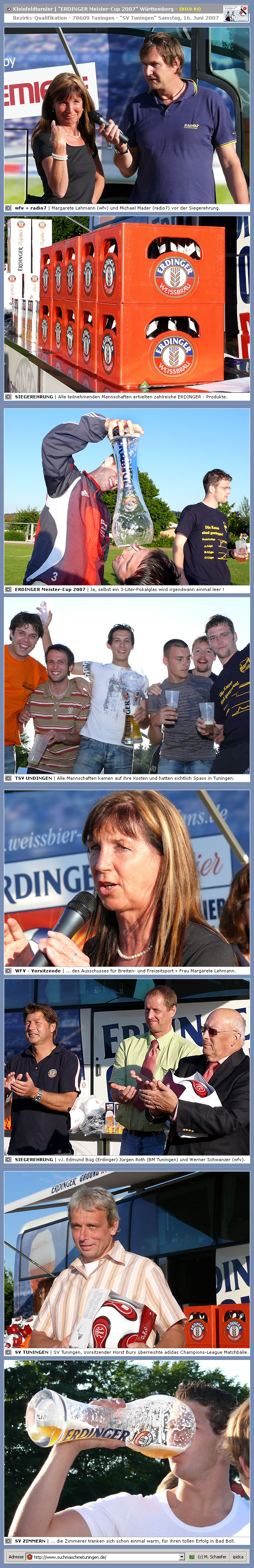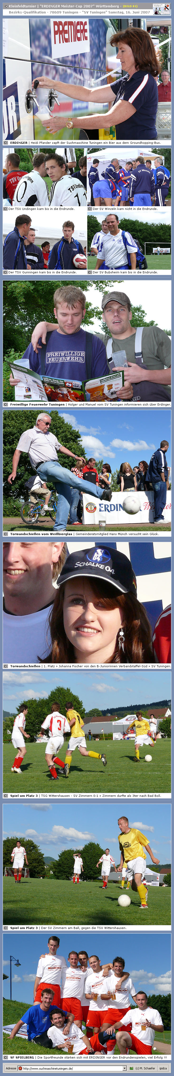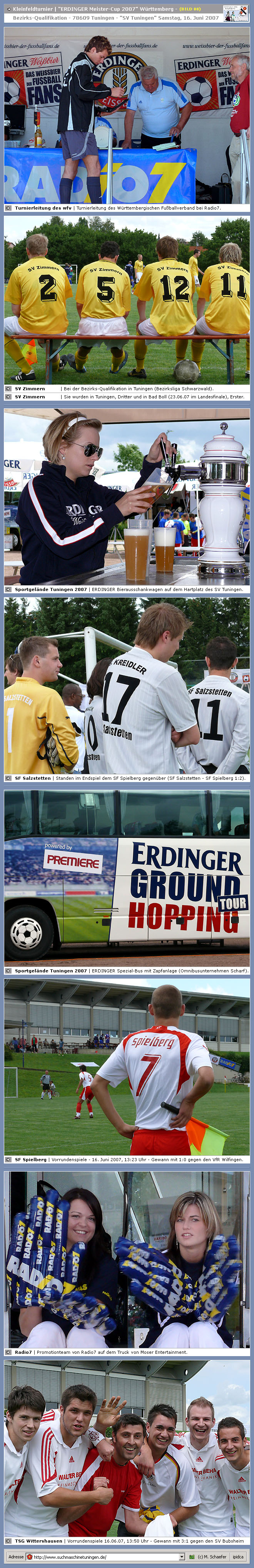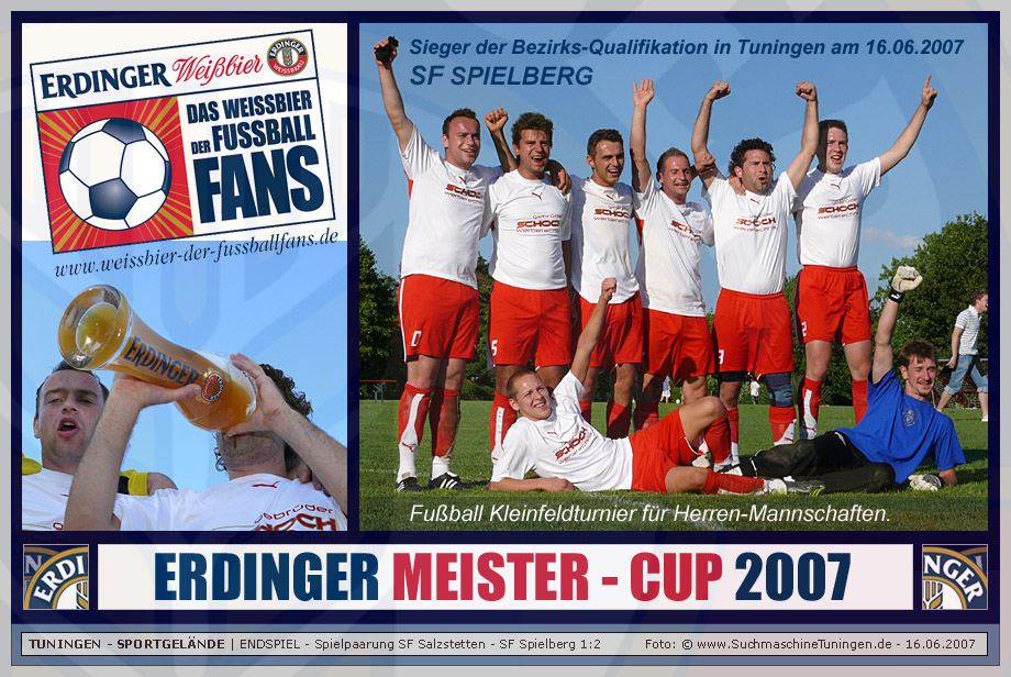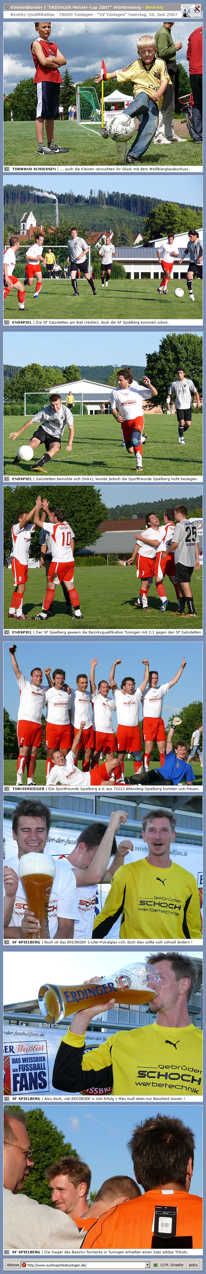 Der im Jahre 1975 von Altensteig eingemeinde Ort Spielberg mit 1265 Einwohnern (72213 Altensteig-Spielberg), hat mit seiner Fussballabteilung, den Sportfreunden Spielberg e.V., das Turnier in Tuningen gewonnen. Sie sind auch Meister 2006/07 der Spielklasse/Kreisligen B im Bezirk Böblingen/Calw (Kreisliga B, Staffel I). Auch der Finalist, die Sportfreunde Salzstetten (Kreisliga A, Nördlicher Schwarzwald) und der Bezirksligameister SV Zimmern (Bezirk Schwarzwald) hat sich für das Landesfinale in Bad Boll qualifiziert. » Privatbrauerei Erdinger Weißbräu lud ein » Direkt nach dem Saisonende lud die weltgrößte Weißbierbrauerei, die Privatbrauerei Erdinger Weißbräu (Werner Brombach GmbH), der Württembergische Fußballverband (wfv) und die ausrichtenden Vereine an vier Bezirks-Qualifikation-Austragungsorten zum ERDINGER Meister-Cup 2007 ein, der erstmalig auch in Baden-Württemberg ausgetragen wurde. Alle 155 Meister der Aktiven aus 16 Bezirken von der Kreisliga C bis zur Oberliga wurden vom WFV-Präsident Herbert Rösch zum Kräfte messen eingeladen, um auf dem Kleinfeld den "Meister der Meister" zu ermitteln, leider nahmen viele Teams diese Möglichkeit nicht wahr. Werbung von ERDINGER vor dem Turnier in Tuningen in Form von Flyern oder Programmheften, wie sie der SV Tuningen bei seinem Internationalen A Juniorenturnieren immer an die Haushalte verteilte oder große Transparente im Ort waren nicht gegeben, so war die Zuschauerresonanz nicht ausreichend. » Grossartige Kulisse auf dem SVT Sportgelände » Auf dem Sportgelände selbst, stimmte die Kulisse, wie Harald Maier Webbeauftragter des SV Tuningen stolz betonte. Die Bezirksvorrunden fanden am Samstag, 16. Juni 2007 in 73550 Waldstetten (Turniersieger: KF Kosova Bernhausen) und in 78609 Tuningen (Turniersieger: SF Spielberg) statt. In Tuningen (Schwarzwald-Baar Kreis - 2861 Einwohner - 743 m ü. NN), für die Meister der Bezirke Alb, Böblingen/Calw, Nördlicher Schwarzwald und Schwarzwald. Am Sonntag, 17. Juni 2007 in 74589 Gröningen-Satteldorf (Turniersieger: TURA Untermünkheim) und in 88447 Warthausen (Turniersieger: FV Neufra). Am Samstag, 23. Juni 2007 fand das Landesfinale für Württemberg in 73083 Bad Boll (Landkreis Göppingen - 7270 Einwohner - 427 m ü. NN) für die bestplatzierten Mannschaften aus den Vorrundenturnieren statt. (Gesamtsieger in Bad Boll wurde der SV Zimmern). » Sportverein Tuningen bestens gerüstet » Der Sportverein Tuningen freute sich auf ein tolles und faires Turnier, den teilnehmenden Mannschaften den erhofften Erfolg und den Zuschauern viel Spaß bei Musik und Action. Die Mannschaften und Besucher wurden durch Bombenwetter in Tuningen begrüßt. Am Vortag beim Aufbau des zahlreichen Equipments regnete es. Am Samstag, 16. Juni 2007 wurden in Tuningen auf dem Sportgelände des SV Tuningen in der Talstrasse von 13.00 bis 18:50 Uhr auf 2 Spielfeldern (Normalspielfeld quer mit 5m x 2m Tor) mit je 5 Feldspielern und 1 Torwart je 10 Minuten lang die Vorrundenspiele mit folgenden 12 Mannschaften bestritten. » Teilnehmer der Vorrunde in Tuningen » Gruppe A: TSV Undingen (Meister Kreisliga A 1, Bezirk Alb) SF Salzstetten (Kreisliga A 2, nördlicher Schwarzwald) TSV Gunningen (Kreisliga C 3, Schwarzwald) Türkischer SV Schramberg (Kreisliga C 1, Schwarzwald) VfR Wilflingen (Kreisliga B 1, Schwarzwald) SF Spielberg (Kreisliga B 1, Böblingen/Calw) Gruppe B: SV Beffendorf (Kreisliga A 1, Schwarzwald) SV Zimmern (Bezirksliga, Schwarzwald) SV Winzeln (Kreisliga C 2, Schwarzwald) SV Bubsheim (Kreisliga B 2, Schwarzwald) TSG Wittershausen (Kreisliga B 2, nördlicher Schwarzwald) Spvgg. Aldingen (Kreisliga A 2, Schwarzwald). » Spannende Endrunde in Tuningen » Von 17:15 - 18:50 fand die Endrunde in Tuningen mit folgenden Ergebnissen statt. Halbfinale: TSG Wittershausen - SF Spielberg 0:2 Halbfinale: SF Salzstetten - SV Zimmern 1:0 Spiel um Platz 3: Wittershausen - SV Zimmern 0:1 Endspiel: SF Salzstetten - SF Spielberg 1:2 Endplazierungen: 1. SF Spielberg (Kreisliga B 1, Böblingen/Calw) 2. SF Salzstetten (Kreisliga A 2, nördlicher Schwarzwald) 3. SV Zimmern (Bezirksliga, Schwarzwald) 4. TSG Wittershausen (Kreisliga B 2, nördlicher Schwarzwald) » SVT - Exzellente Bewirtung und Spieler(innen) » Für die Bewirtung mit Speisen und Getränke, sowie Kaffee und Kuchen wurde durch zahlreichen Helfer des SV Tuningen unter dem Vorsitz von Horst Bury und seinem Festwirt und Organisationsleiter Norbert Kutscher gesorgt. Bürgermeister Jürgen Roth, die Freiwillige Feuerwehr Tuningen (Parkplatzeinweisung) und der Bereitschaftsdienst des DRK Tuningen rundeten das Gesamthelferteam ab. Beim Torwandschießen vom Weißbierglas konnte die Fußballspielerin Johanna Fischer von den B-Juniorinnen Verbandstaffel Süd - SV Tuningen, vor Manuel Antes, Spieler der 1. Mannschaft des SV Tuningen (Herren Kreisliga A Bezirk Schwarzwald Staffel II) und Stefan Förnbacher B-Jugend, von der SG Tuningen/Durchhausen, brillieren. » ERDINGER Groundhopping-Bus mit Zapfanlage » Im ERDINGER Groundhopping-Bus mit Zapfanlage, Mini-Küche und Flatscreens konnte vorn oder hinten in der gemütlichen Sitzecke mit Tischen mit einem kühlen Getränk Platz genommen werden. Da außen am Bus Zapfhähne angebracht waren, konnte auch vor dem Bus an einer Stehtheke bei Edmund Büg und Heidi Pfander von Erdinger Promotion ein Bier getrunken werden, wobei sich die meißten Besucher aber an einem separaten Bierstand von ERDINGER neben Radio 7 (Radio 7 war mit Redakteur Michael Mader vor Ort) Bier oder beim Sportverein ein Getränk und Speisen holten um auf dem Hartplatz, der mit Brauereitischen- und bänken bestückt war, den spannenden kurzweiligen Spielen zuzuschauen, die vom wfv Verbandsliga-Schiedsrichter Benjamin Butz und den wfv Landesliga-Schiedsrichtern Ralf Fechter, Norbert Hellstern, Adam Waleczko, Richard Fridrich und Philipp Lehmann hervorragend gepfiffen wurden. » Ein Satz adidas-Trikots für Spielberg » Alle Bezirkssieger (Sieger der Vor