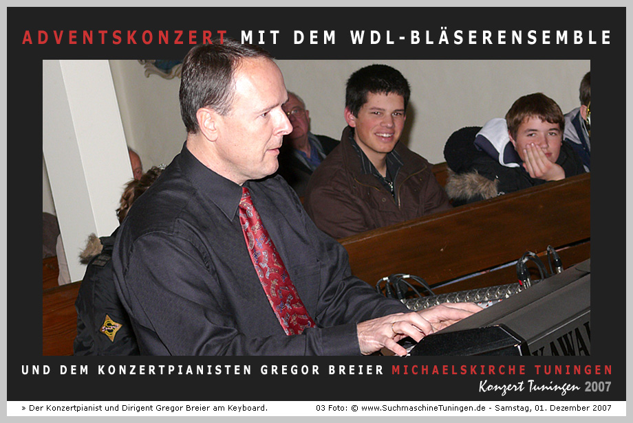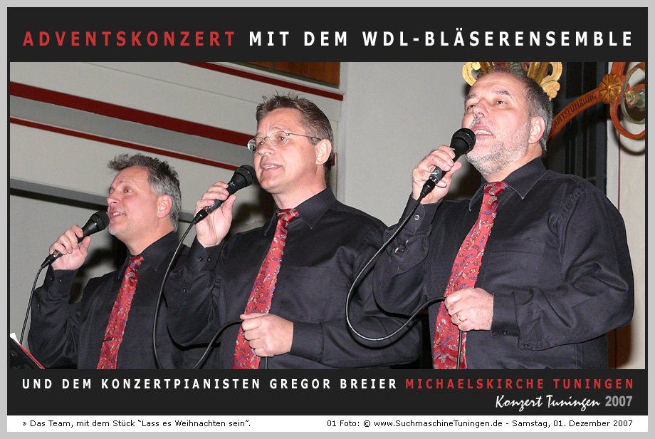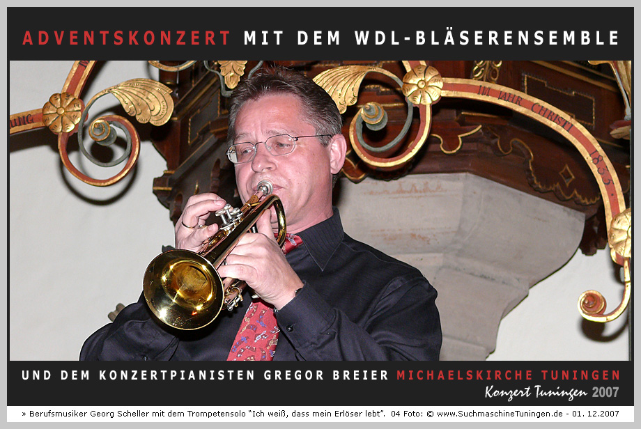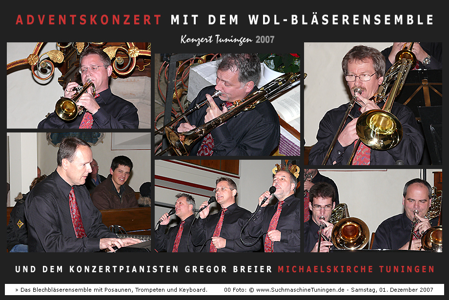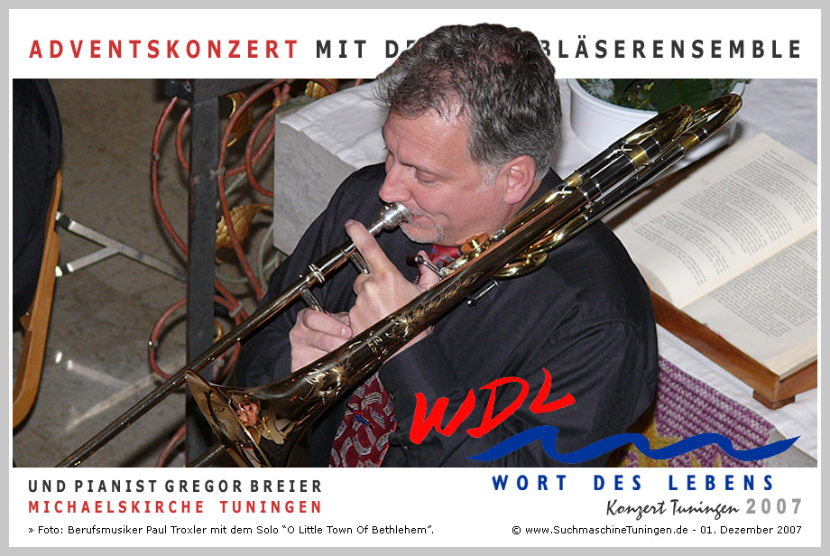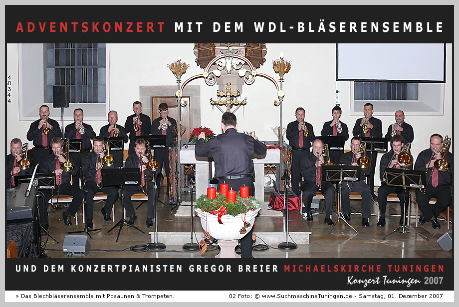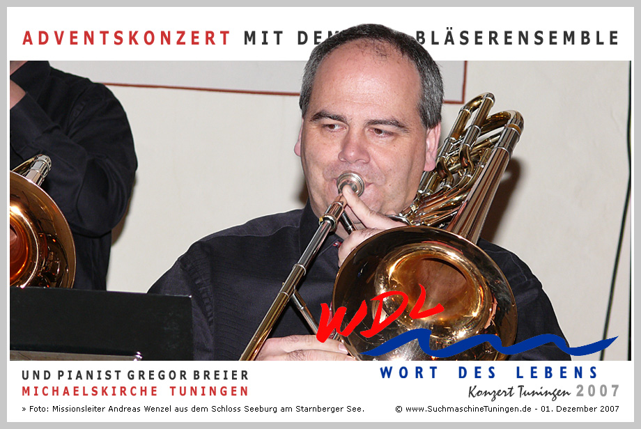 Das Blechbläserensemble von "Wort des Lebens" (WDL), einem Jugendmissionswerk mit Sitz im Schloss Seeburg und Unterallmannshausen in 82328 Berg am Starnberger See in Bayern, gastierte in der Evangelischen Michaelskirche in 78609 Tuningen, Baden-Württemberg. » Wort des Lebens aus Berg-Allmannshausen » Wort des Lebens arbeitet auf überkonfessioneller Basis und ist seit 1969 im idyllischen Schloss Unterallmannshausen beheimatet, wo sich Jugendliche aus aller Welt und allen Nationalitäten begegnen. Veranstalter des Adventskonzert in Tuningen war die Christliche Gemeindemusikschule Tuningen und die Altpietistische Gemeinschaft "die apis", Tuningen. Unter dem Motto "IN DULCI JUBILO" wurde musikalisch auf die beginnende Weihnachtszeit mit einem 2-stündigen Adventskonzert eingestimmt. Das Adventskonzert des WDL fand in Zusammenarbeit mit dem Konzertpianisten Gregor Breier statt, der bereits seit 1989 mit dem "Missionswerk Wort des Lebens e.V." zusammenarbeitet und der die Bläser auch dirigiert. » Begrüßung durch den Tuninger Gebhard Quass » Zum Auftakt spielte das Ensemble das fast 4-minütige "In Dulci Jubilo". Nun begrüßte der Veranstalter von den Apis Tuningen und der Christlichen Gemeindemusikschule Tuningen, Gebhard Quass die 200 Gäste, die Evangelische Kirchengemeinde Tuningen mit Hausherr und Pfarrer Andreas Heid, das Bläserensemble des WDL, Dirigent und Konzertpianist Gregor Breier und den Moderator des Abend, Detlef Kiparski vom WDL in der Tuninger Michaelskirche. » 17 Bläser, 1 Pianist und 1 Moderator vor Ort » Mit "Ein Stern strahlt hell", spielte sich dass derzeit aus 2 Berufsmusikern und 15 Laienmusikern bestehende Trompeten und Posaunen Ensemble, dass aus hauptsächlich ehrenamtlichen Bläser und Bläserinnen besteht, warm. Der Jugendfreizeitverantwortliche des WDL, Herr Detlef Kiparski stellte die einzelnen Mitglieder, die aus dem gesamten Bundesgebiet wie z.B. aus Sindelfingen, Unterensingen, Ihringen, Rastatt, Schönaich, Reutlingen, Enzweihingen, Hohenhaslach, Berg, Metzingen, Althütte, Heidelsheim bei Bruchsal, Allmannshausen oder Ihringen am Kaiserstuhl stammen, vor. » Das Ensemble mit einem Adventslieder-Potpourri » Das Ensemble spielte dann ein Adventslieder-Potpourri, gefolgt von einem Keyboardsolo mit dem besinnlichen "Herbei, o ihr Gläubigen" von dem gebürtigem Duisburger Herrn Breier (47), der in Köln aufgewachsen ist und dort auch Musik studierte. Die Bläser spielten nun "It Came Upon A Midnight Clear", gefolgt von einem sehr schönen Orgelwerk für Klassikliebhaber mit "Präludium und Fuge in C# Dur" von Johann Sebastian Bach, dem deutschen Komponisten des Barock, wunderbar interpretiert vom Tastenvirtuosen am Keyboard, mit Gregor Breier, der zu Hause selbstverständlich an einem Konzertflügel und am liebsten klassische Stücke von Chopin spielt. Die Bläser folgten mit "The First Noel", einem sehr beliebten Weihnachtslied. » Infoblock von Herrn Kiparski über WDL » In einer kleinen Pause für die Musiker, wurde ein Infoblock von Herrn Kiparski eingefügt. In den Schlössern des WDL, in guter Lage werden Freizeiten und Seminare für Kids, Jugendliche, Junge Erwachsene und Familien angeboten. Für Aktive werden auch Ski- und Snowboardfreizeiten sowie Lauf- und Walkingwochen angeboten. Da seit neuestem, ein weiterer Standort für ein Esra-Trainingszentrum am Nordufer des Köriser Sees, zwischen Spreewald und Berlin gefunden wurde, kann dort auch eine Kanu- und Kajakwoche angeboten werden. Mit dem Esra - Training, dem WDL-Jüngerschaftsprogramm, sollen junge Leute unter Anleitung Tiefgang in der Beziehung zu Gott bekommen und Jesus nachfolgen. » CD-Produktionen des WDL-Verlag » Es gibt Weihnachtskonzert CD's wie "The Heavens Sing Hallelujah" oder "In Dulci Jubilo" oder "Superstar(k)!? - Petrus, Ein Musical für Kids & Teens" oder "Modern Piano Classics" Berühmte klassische Melodien von Gregor Breier. Sodann spielten die Bläser und der Pianist das etwas wilde englische Weihnachtslied "God Rest Ye Merry Gentlemen" und die Bläser "Deck The Halls" & "Leise rieselt der Schnee". Flott ging es mit dem sehr schönen Stück "Winter Wonderland" und Herrn Breier weiter, gefolgt von beschwinglichen Klängen mit "White Christmas", gespielt vom Bläserensemble. Unterbrochen wurden die einzelnen Stücke vom Geräusch der klatschenden Menge, die die Arbeit der Musiker lautstark honorierten. » Posaunensolo "O Little Town Of Bethlehem" » Mit dem Posaunensolo "O Little Town Of Bethlehem" vom Berufsmusiker Paul Troxler (WDL) und dem vom Team gesungenen "Lass es Weihnachten sein", konnte nun auch das zweite Weihnachtslieder - Potpourri geblasen und von den Zuhörern genüsslich in der Kirche in wohliger Atmosphäre gehört werden. Der Missionsleiter, Prediger, Musiker und Posaunist Andreas Wenzel lobte nach dem Konzert, die Raumakustik der Tuninger Michaelskirche, in der die Töne nicht wie in einer sehr großen Halle schnell verloren gehen. Die Bläser begeisterten die Tuninger Musikliebhaber mit einem zweiten Weihnachtslieder - Potpourri und dem Trompetensolo "Ich weiß, dass mein Erlöser lebt" vom Berufsmusiker Georg Scheller (WDL). » Kurzbotschaft über unseren König » Nun gab es eine Kurzbotschaft von Prediger Detlef Kiparski, in der der italienische Jugendliche Luca im November 2002, nachts vor dem Hotel Adlon in Berlin draussen im kalten wartete, in Anbetracht ob er einen Blick auf Michael Jackson werfen könne, der tags zuvor (19.11.2002) für weltweite Empörung gesorgt hatte, indem er stolz seine Tochter vom vierten Stock aus, am Fenster zeigte und anschliessend seinen neun Monate alten Sohn präsentierte und über die Balkonbrüstung hob. Luca hatte die "Vorstellung" von Jackson verpasst und hoffte, dass sich der "King of Pop" eventuell noch einmal zeigen würde, doch die Vorhänge blieben zu. Der Prophet Sacharja aber macht den Vorhang weit auf, um auf uns Menschen zuzukommen. Seine Ankündigung hieß: "Siehe, dein König kommt zu dir!", do
