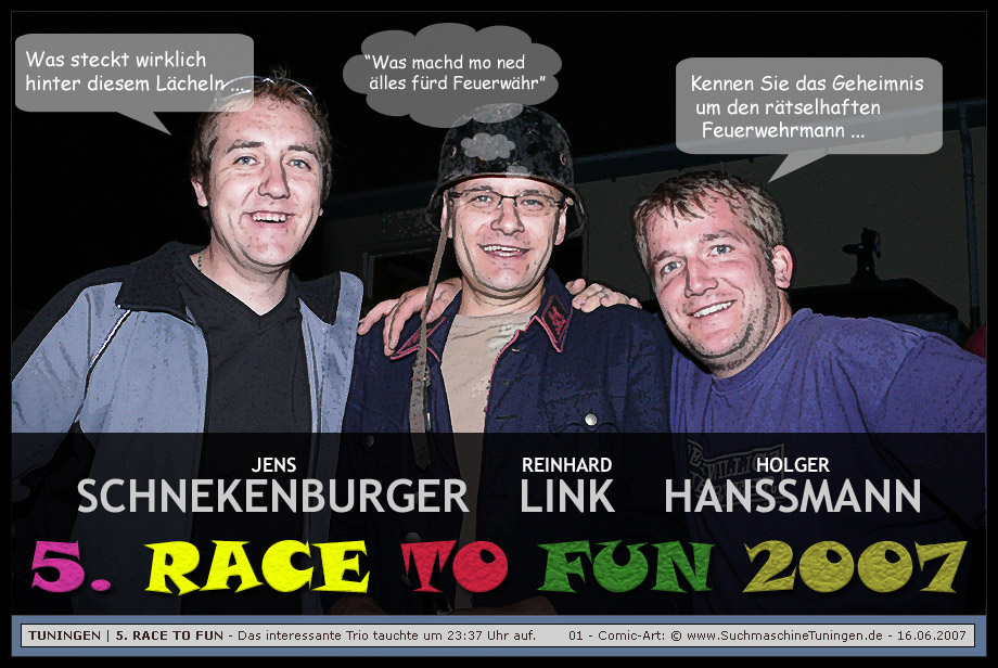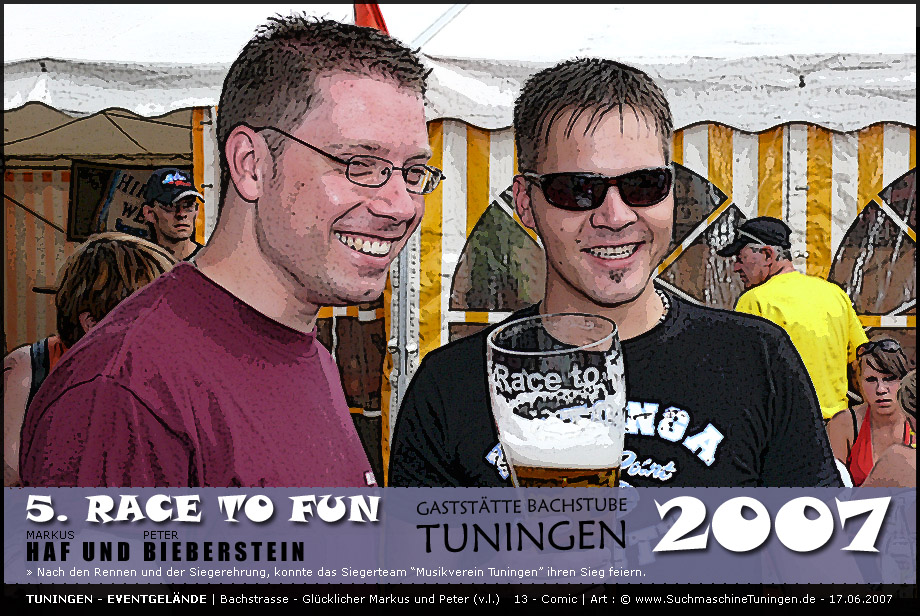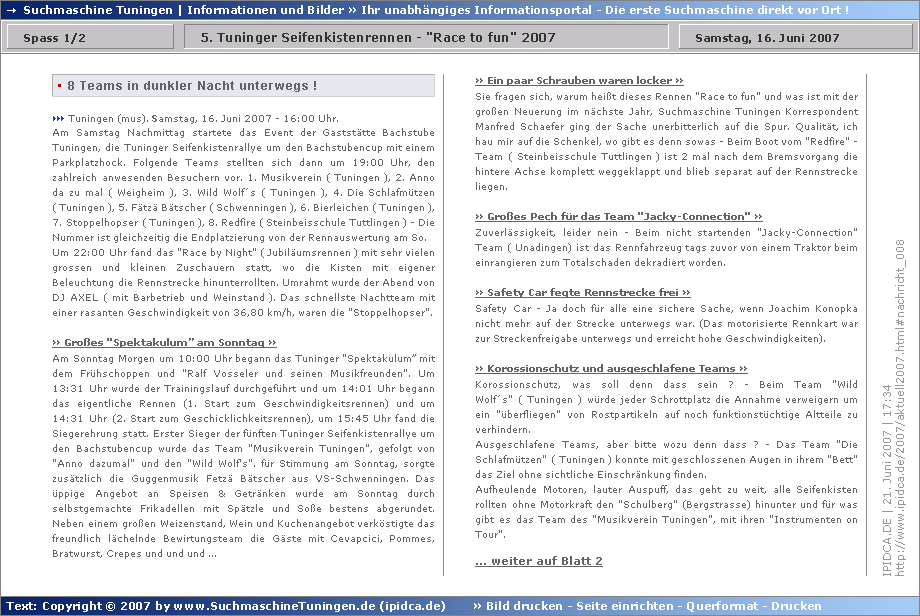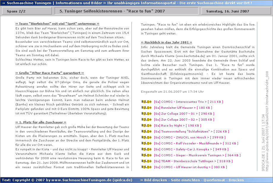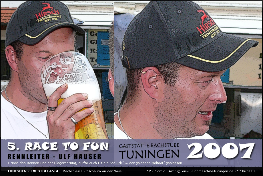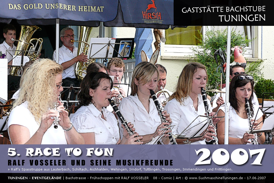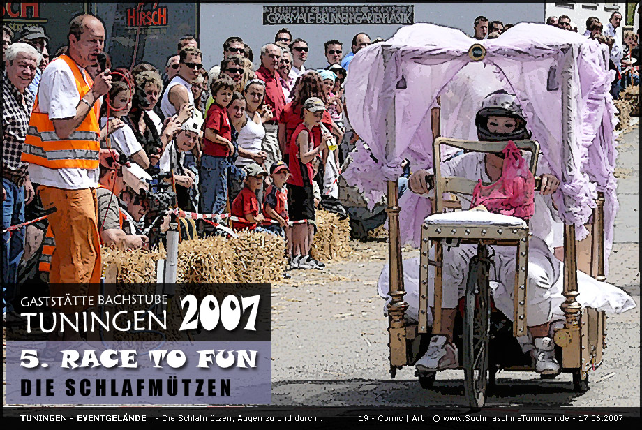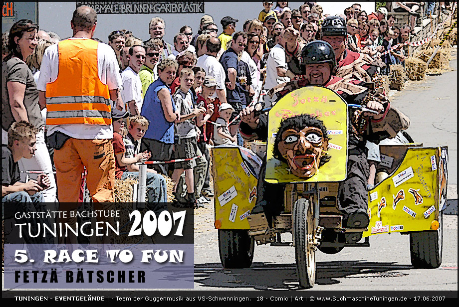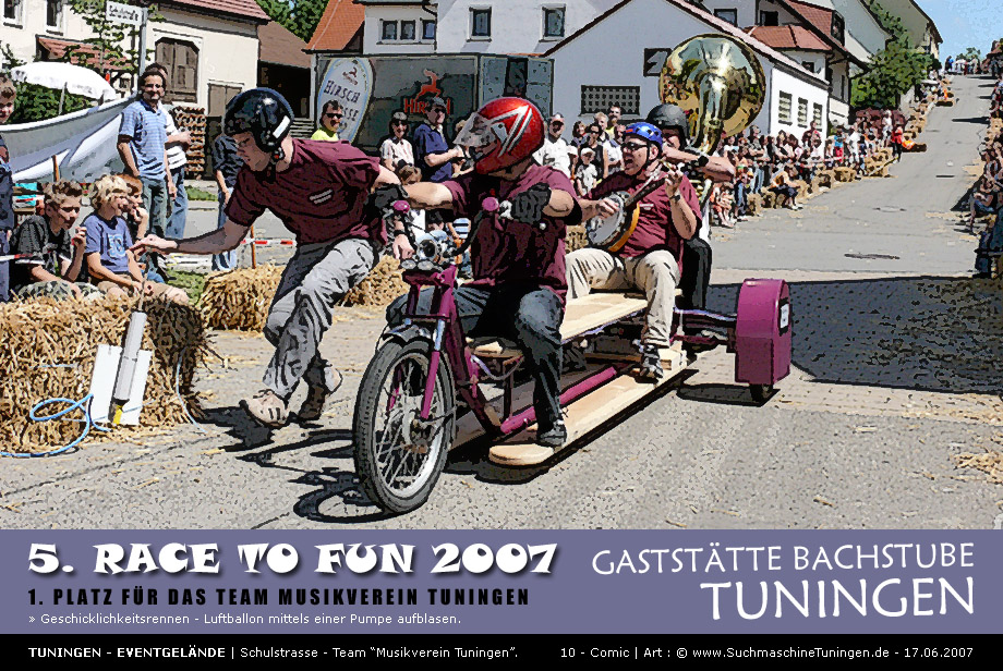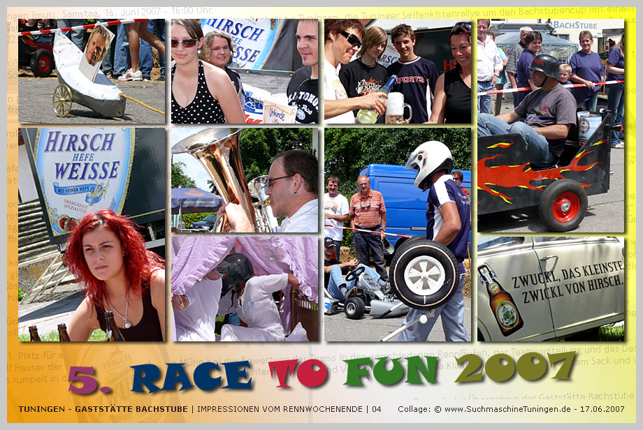 Am Samstag Nachmittag startete das Event der Gaststätte Bachstube Tuningen, die Tuninger Seifenkistenrallye um den Bachstubencup mit einem Parkplatzhock. Folgende Teams stellten sich dann um 19:00 Uhr, den zahlreich anwesenden Besuchern vor. 1. Musikverein ( Tuningen ), 2. Anno da zu mal ( Weigheim ), 3. Wild Wolf´s ( Tuningen ), 4. Die Schlafmützen ( Tuningen ), 5. Fätzä Bätscher ( Schwenningen ), 6. Bierleichen ( Tuningen ), 7. Stoppelhopser ( Tuningen ), 8. Redfire ( Steinbeisschule Tuttlingen ) - Die Nummer ist gleichzeitig die Endplatzierung von der Rennauswertung am So. Um 22:00 Uhr fand das "Race by Night" ( Jubiläumsrennen ) mit sehr vielen grossen und kleinen Zuschauern statt, wo die Kisten mit eigener Beleuchtung die Rennstrecke hinunterrollten. Umrahmt wurde der Abend von DJ AXEL ( mit Barbetrieb und Weinstand ). Das schnellste Nachtteam mit einer rasanten Geschwindigkeit von 36,80 km/h, waren die "Stoppelhopser". » Großes "Spektakulum am Sonntag » Am Sonntag Morgen um 10:00 Uhr begann das Tuninger "Spektakulum mit dem Frühschoppen und "Ralf Vosseler und seinen Musikfreunden". Um 13:31 Uhr wurde der Trainingslauf durchgeführt und um 14:01 Uhr begann das eigentliche Rennen (1. Start zum Geschwindigkeitsrennen) und um 14:31 Uhr (2. Start zum Geschicklichkeitsrennen), um 15:45 Uhr fand die Siegerehrung statt. Erster Sieger der fünften Tuninger Seifenkistenrallye um den Bachstubencup wurde das Team "Musikverein Tuningen", gefolgt von "Anno dazumal" und den "Wild Wolf's". für Stimmung am Sonntag, sorgte zusätzlich die Guggenmusik Fetzä Bätscher aus VS-Schwenningen. Das üppige Angebot an Speisen & Getränken wurde am Sonntag durch selbstgemachte Frikadellen mit Spätzle und Soße bestens abgerundet. Neben einem großen Weizenstand, Wein und Kuchenangebot verköstigte das freundlich lächelnde Bewirtungsteam die Gäste mit Cevapcici, Pommes, Bratwurst, Crepes und und und ... » Ein paar Schrauben waren locker » Sie fragen sich, warum heißt dieses Rennen "Race to fun" und was ist mit der großen Neuerung im nächsten Jahr, Suchmaschine Tuningen Korrespondent Manfred Schaefer ging der Sache unerbitterlich auf die Spur. Qualität, ich hau mir auf die Schenkel, wo gibt es denn sowas - Beim Boot vom "Redfire" - Team ( Steinbeisschule Tuttlingen ) ist 2 mal nach dem Bremsvorgang die hintere Achse komplett weggeklappt und blieb separat auf der Rennstrecke liegen. » Großes Pech für das Team "Jacky-Connection" » Zuverlässigkeit, leider nein - Beim nicht startenden "Jacky-Connection" Team ( Unadingen) ist das Rennfahrzeug tags zuvor von einem Traktor beim einrangieren zum Totalschaden dekradiert worden. » Safety Car fegte Rennstrecke frei » Safety Car - Ja doch für alle eine sichere Sache, wenn Joachim Konopka nicht mehr auf der Strecke unterwegs war. (Das motorisierte Rennkart war zur Streckenfreigabe unterwegs und erreicht hohe Geschwindigkeiten). » Korossionschutz und ausgeschlafene Teams » Korossionschutz, was soll denn dass sein ? - Beim Team "Wild Wolf´s" ( Tuningen ) würde jeder Schrottplatz die Annahme verweigern um ein "überfliegen" von Rostpartikeln auf noch funktionstüchtige Altteile zu verhindern. Ausgeschlafene Teams, aber bitte wozu denn dass ? - Das Team "Die Schlafmützen" ( Tuningen ) konnte mit geschlossenen Augen in ihrem "Bett" das Ziel ohne sichtliche Einschränkung finden. Aufheulende Motoren, lauter Auspuff, das geht zu weit, alle Seifenkisten rollten ohne Motorkraft den "Schulberg" (Bergstrasse) hinunter und für was gibt es das Team des "Musikverein Tuningen", mit ihren "Instrumenten on Tour". » Team "Bierleichen" mit viel "Sprit" unterwegs » Es gibt kein Bier auf Hawai, kann schon sein, aber auf der Rennstrecke von 137m, blieb das Team "Bierleichen" ( Tuningen) in einem Zeitraum von 15,4 Sekunden dank bordeigener Bierreserven nicht auf dem Trockenen sitzen. Boxenluder von verschiedenen Teams sind selbstverständlich auch vor Ort, schöner wie sie in Hockenheim und auf dem Nürburgring nicht zu finden sind. Sie sind auch bei der Teamvorstellung am Samstag und zum anfeuern ihrer Teams am Sonntag mit dabei. Schlechtes Wetter, nein in Tuningen beim Race to fun gibt es kein Wetter, es ist einfach nur schön. » Große "After Race Party" garantiert » Große Party mit bekannten DJs, sicher doch, wenn der Tuninger AXEL auflegt, legt selbst die 87-jährige Oma, die gerade die Polizei wegen Ruhestörung anrufen wollte den Hörer zur Seite und schleppt sich in Hausschlappen zur Bühne hin und ist einfach nur glücklich. Sie sehen alles läuft super, selbst wenn das "Bruzelteam" um Helmut Schmider mal wieder in leichte Verzögerungen kommt, kann man nebenan beim anderen Helmut (Barrho) ein kleines frisch gekühltes Getränk zu sich nehmen. - Schnell ein Parkplatz gefunden und mit 0 Euro Eintritt, 100% Spass und gute Bewirtung ist mit TÜV garantiert (Teilnehmer Überleben Veranstaltung). » 1. Platz für alle Zuschauer » Ulf Hauser der Rennleiter gab sich große Mühe bei der Bewertung der Teams in den verschiedenen Rennläufen, der Teamvorstellung und des Design der Kisten um die Plazierungen zu ermitteln. Super, aber den 1. Platz machen immernoch die Zuschauer an der Strecke und dem Festgelände, der 1. Platz für alle die vor Ort waren. Es rumpelt in der Kiste - und das nicht zu knapp! - Rennleiter Ulf Hauser und Veranstalterin Michaela Klante ließen die Katze aus dem Sack und verkündeten für 2008 eine revolutionäre Neuerung beim 6. Race to fun am Samstag, den 21. Juni 2008. Mülltonnenrennen heißt das Zauberwort und ist ein neues zusätzliches Format zum traditionellen Seifenkistenrennen in Tuningen. "Race to fun" ist eben ein erlebnisreiches Highlight das Sie live gesehen haben müßen, denn die Erfolgsgeschichte des großen Sommerevent in Tuningen geht weiter. » Rückblick in das Jahr 2001 » Info: Jahrelang hielt die Gemeinde Tuningen einen Dornröschenschlaf in Sachen Spassevent. Erst mit der Übernahme der Gaststätte Bachstube