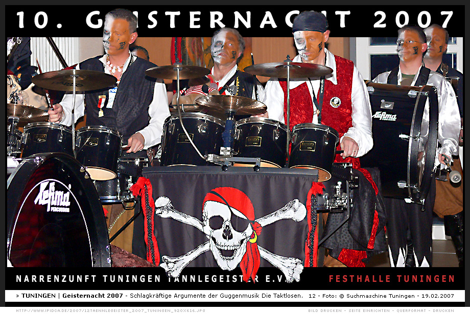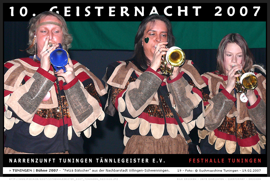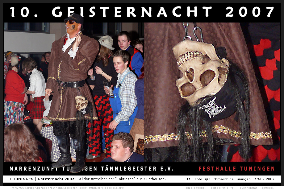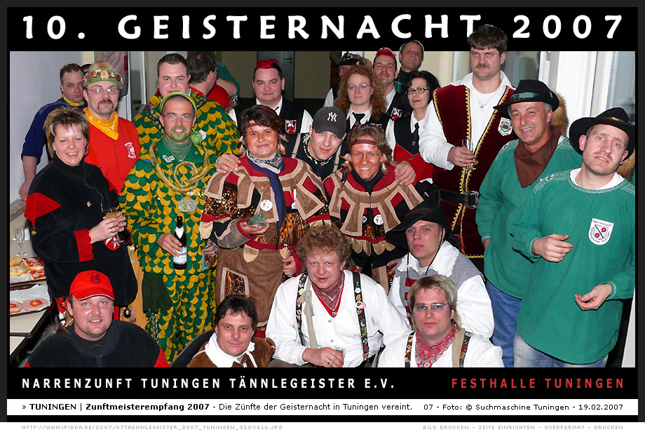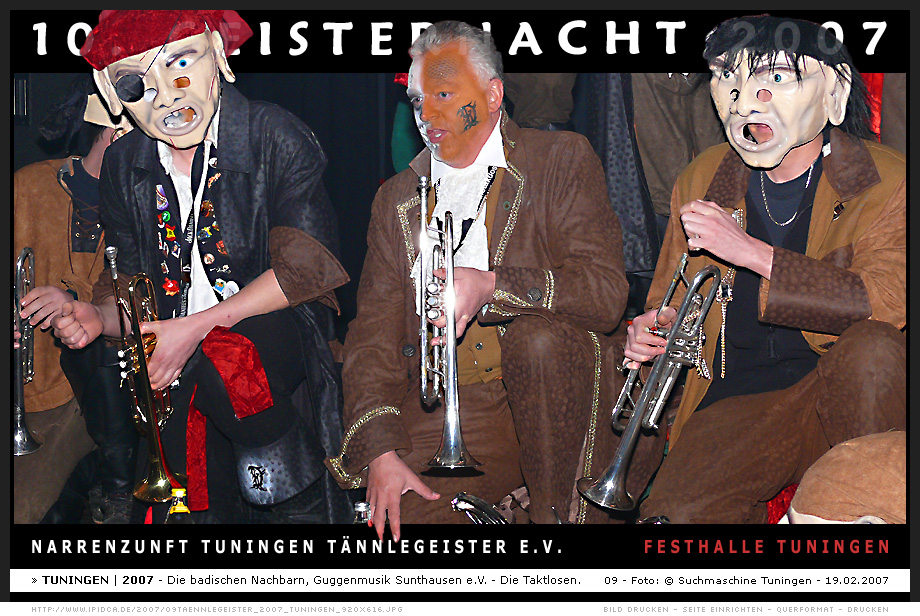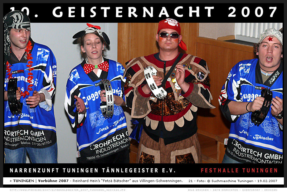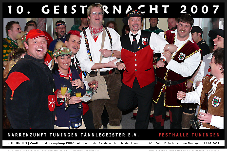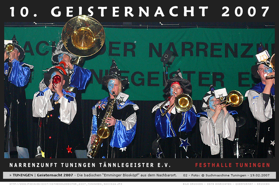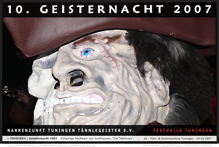 Die Tuninger Tännlegeister luden zur 10. Geisternacht am 19. Februar 2007 in die Festhalle um 20:01 Uhr ein. Blos Köpf sah man am Beginn des Abendprogramm nicht, als Udo Fischerkeller's Guggenmusik Emminger Blosköpf auftraten, denn sie trugen ein sehr schönes Kostüm und zogen 20 Minuten die Besucher in ihren Bann. Zum Heulen war den zahlreichen Besuchern und Zünften auch nicht, als anschließend Winfried Degen's Guggenmusik Tuninger Burgheuler auftraten. Nur ein kleines Fleckchen Zeit, nahmen sich die Neckar Fleckle von Andreas Hippe aus VS-Schwenningen. Guggenmusik Sunthausen e.V. - Die Taktlosen (1985): Um 22:00 Uhr formierte sich die überhaupt nicht taktlose Guggenmusik Die Taktlosen aus unserem südlichen Nachbarort Sunthausen im Foyer, und marschierten mit einer unglaublichen Energie und ohrenbetäubenden Schlag- u. Blasinstrumenten in einem fetten Rhythmus mit überproportionalen Masken, die mit leuchtenden Augen ausgestattet waren, auf die Bühne und den Bühnenvorbereich. 34 Minuten lang hatten Daniel Hug's 35 Taktlose die bebende Halle in der Hand. Die Tuninger Festhalle bebte wieder: Bebende Halle in Tuningen, den es heißt hier nicht nur "...die Hände in den Himmel" sondern auch mit "...den Füßen auf die Bänke. Mit einer Tanzvorführung der Jazztanzgruppe von Stefan Richt's Ziegel-Buben aus VS-Schwenningen ging es gar nicht büblich, sondern weiblich weiter. Nicht gescheckt, sondern sehr traditionell gekleidet trat der Fanfarenzug Scheckenbühl von Thomas Klietz aus der von Tuningen östlich liegenden Nachbargemeinde Durchhausen auf. Ein Fluch der Karibik war das Motto der spontanen Einlage von Tuningern mit ihrer Piratenvorführung, doch für die Besucher eine schöne Bereicherung. Guggenmusik Fetzä Bätscher aus VS (1994): Ordentlich gebätscht hat es bei dem Auftritt von Reinhard Hein's Fetzä Bätscher aus Villingen-Schwenningen. In sehr erdigen und stimmigen Farben gekleidet und mit dunkelhäutigen Masken bestückt, ließen es die Bätscher wieder krachen. Dann standen die "Glücksbärchen" Dominik Bury, Pascal Fritsche und Markus Wipf nach einem feuchten Strip auf einmal nur in Unterhosen auf der Bühne. In Tuningen tobte der Bär, den auch Stefano Caruso's Schwenniger Bären ließen sich das Tuninger Geisterspektakel nicht entgehen. Dieter Merz's Kötach-Buur der Narrenzunft Sunthausen fanden ebenfalls zur Geisternacht, denn sie mußten nur entgegen der Flußrichtung der Kötach entlang nach Tuningen laufen. Schlangenzunft Zarten e.V. (1951): Nicht nur die 30 Schlangen der Schlangenzunft Zarten von Markus Schwär aus dem Dreisamtal östlich von Freiburg, mußten sich ständig durch die Halle schlängen, sondern auch alle anderen zahlreich erschienenen Besucher um zum Beispiel in die Bar auf der Empore zu gelangen. Auch Helmut Overhage's Narrenzunft Weigheim und Ingo Kitzke's Narrenzunft Trossingen, ließen sich noch von den Alphas, einer Band die aus drei Männern und einer Frau besteht bis in die späten Morgenstunden begleiten. Narrenzunft Tuningen - Tännlegeister e.V. (1994): Wie Geister bewegten sich die Tuninger Tännlegeister durch alle Ebenen und Räume in der Tuninger Festhalle, überall und unermüdlich im Einsatz für die Partymeute. "S'war wied'r sche, abr s'isch au sche dasses wied'r vorbei isch und mo sich neue Kräf'd fürd näxschde "Jubiläumsgeisternacht" im Jahr 2008 hola ka." NACHTRAG: Am Dienstag, 20. Februar 2007 um 17:00 Uhr und einer Temperatur von (13,2 °C), wurde der Narrenbaum von Bürgermeister Jürgen Roth und dem Narrenvater der Tännlegeister, Uwe Bioni gefällt.