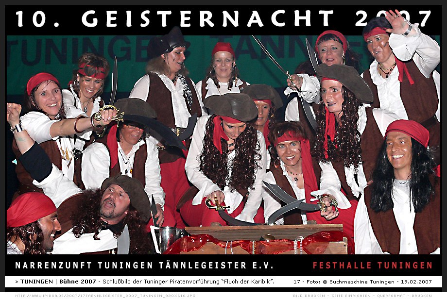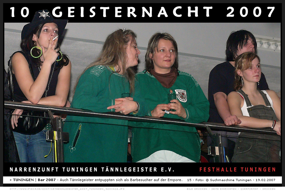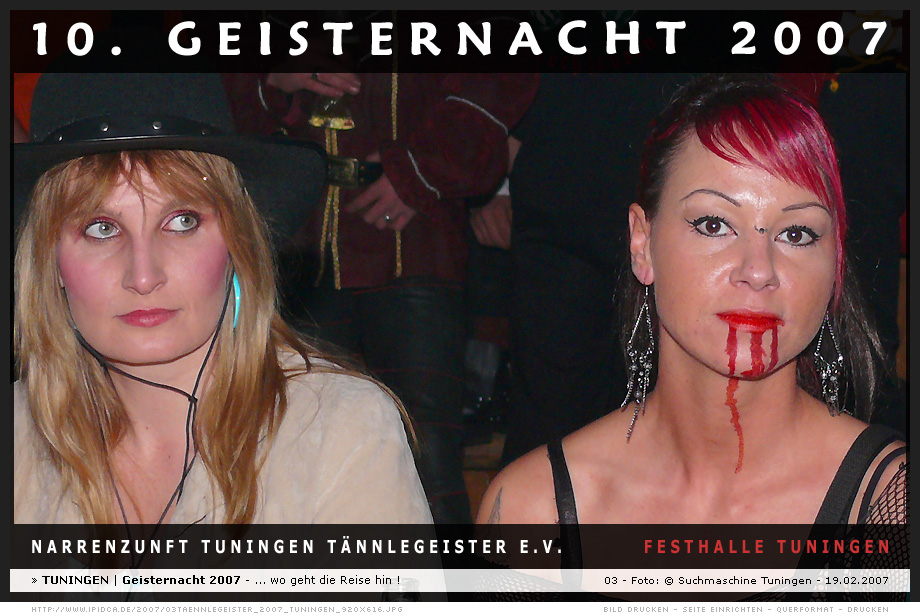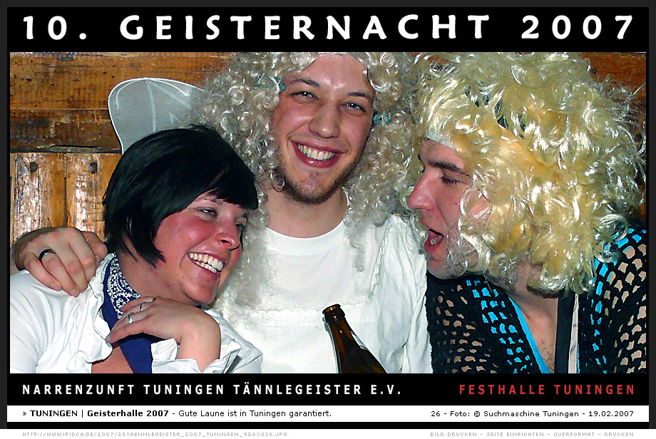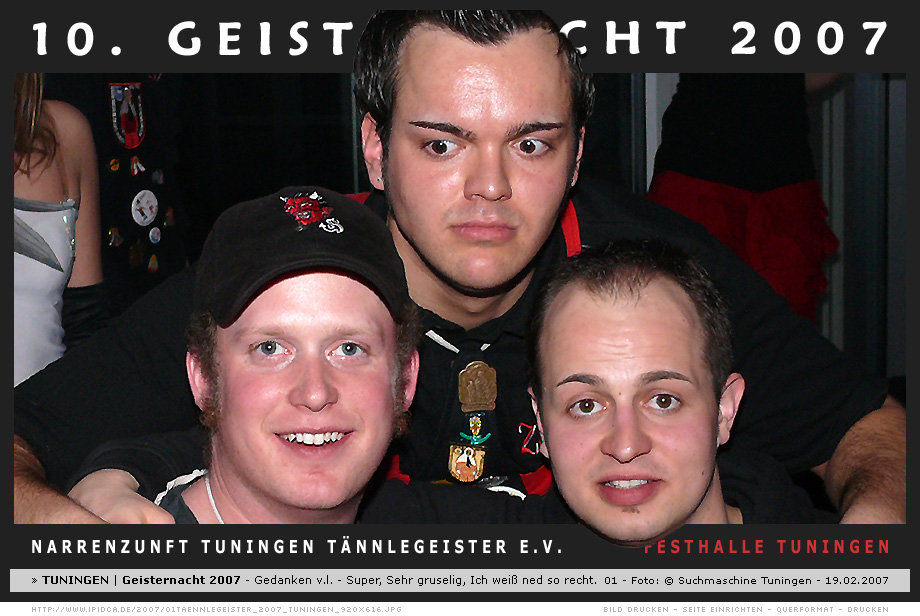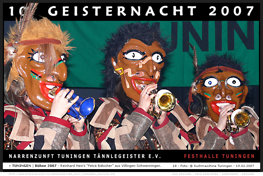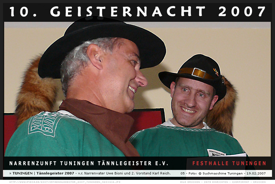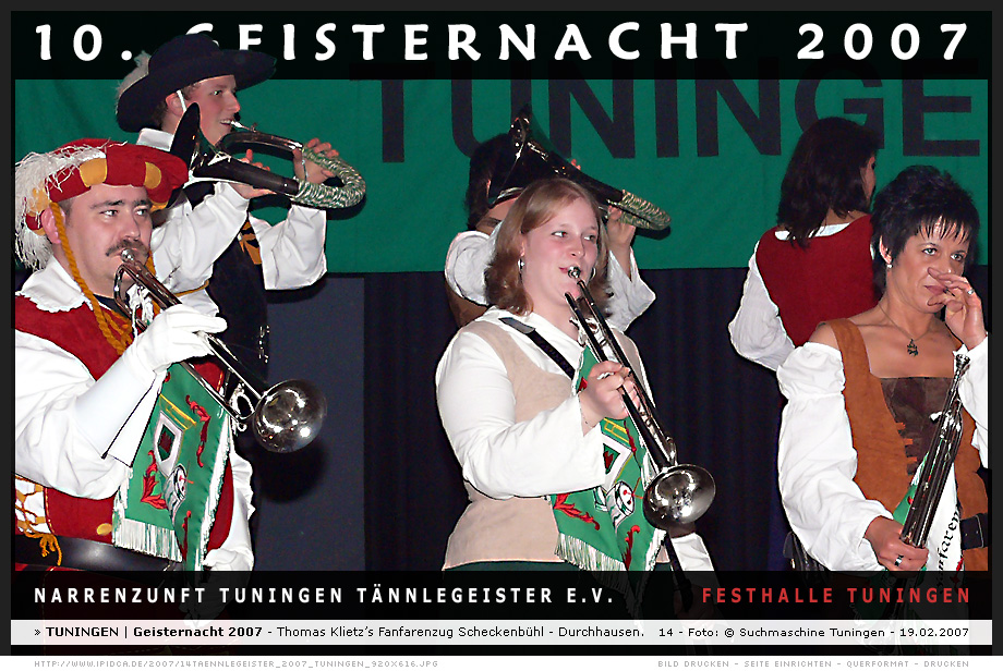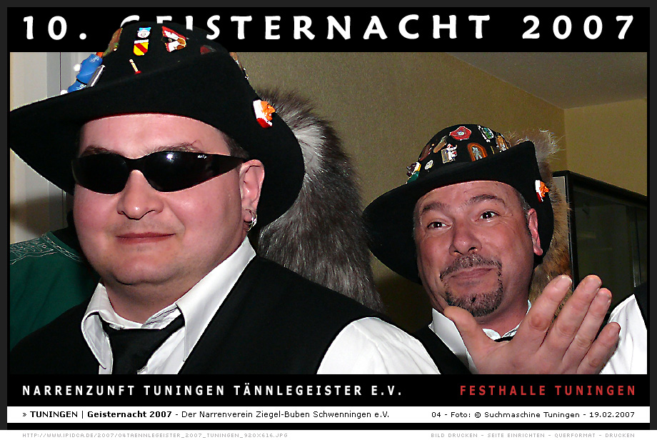 Die Tuninger Tännlegeister luden zur 10. Geisternacht am 19. Februar 2007 in die Festhalle um 20:01 Uhr ein. Blos Köpf sah man am Beginn des Abendprogramm nicht, als Udo Fischerkeller's Guggenmusik Emminger Blosköpf auftraten, denn sie trugen ein sehr schönes Kostüm und zogen 20 Minuten die Besucher in ihren Bann. Zum Heulen war den zahlreichen Besuchern und Zünften auch nicht, als anschließend Winfried Degen's Guggenmusik Tuninger Burgheuler auftraten. Nur ein kleines Fleckchen Zeit, nahmen sich die Neckar Fleckle von Andreas Hippe aus VS-Schwenningen. Guggenmusik Sunthausen e.V. - Die Taktlosen (1985): Um 22:00 Uhr formierte sich die überhaupt nicht taktlose Guggenmusik Die Taktlosen aus unserem südlichen Nachbarort Sunthausen im Foyer, und marschierten mit einer unglaublichen Energie und ohrenbetäubenden Schlag- u. Blasinstrumenten in einem fetten Rhythmus mit überproportionalen Masken, die mit leuchtenden Augen ausgestattet waren, auf die Bühne und den Bühnenvorbereich. 34 Minuten lang hatten Daniel Hug's 35 Taktlose die bebende Halle in der Hand. Die Tuninger Festhalle bebte wieder: Bebende Halle in Tuningen, den es heißt hier nicht nur "...die Hände in den Himmel" sondern auch mit "...den Füßen auf die Bänke. Mit einer Tanzvorführung der Jazztanzgruppe von Stefan Richt's Ziegel-Buben aus VS-Schwenningen ging es gar nicht büblich, sondern weiblich weiter. Nicht gescheckt, sondern sehr traditionell gekleidet trat der Fanfarenzug Scheckenbühl von Thomas Klietz aus der von Tuningen östlich liegenden Nachbargemeinde Durchhausen auf. Ein Fluch der Karibik war das Motto der spontanen Einlage von Tuningern mit ihrer Piratenvorführung, doch für die Besucher eine schöne Bereicherung. Guggenmusik Fetzä Bätscher aus VS (1994): Ordentlich gebätscht hat es bei dem Auftritt von Reinhard Hein's Fetzä Bätscher aus Villingen-Schwenningen. In sehr erdigen und stimmigen Farben gekleidet und mit dunkelhäutigen Masken bestückt, ließen es die Bätscher wieder krachen. Dann standen die "Glücksbärchen" Dominik Bury, Pascal Fritsche und Markus Wipf nach einem feuchten Strip auf einmal nur in Unterhosen auf der Bühne. In Tuningen tobte der Bär, den auch Stefano Caruso's Schwenniger Bären ließen sich das Tuninger Geisterspektakel nicht entgehen. Dieter Merz's Kötach-Buur der Narrenzunft Sunthausen fanden ebenfalls zur Geisternacht, denn sie mußten nur entgegen der Flußrichtung der Kötach entlang nach Tuningen laufen. Schlangenzunft Zarten e.V. (1951): Nicht nur die 30 Schlangen der Schlangenzunft Zarten von Markus Schwär aus dem Dreisamtal östlich von Freiburg, mußten sich ständig durch die Halle schlängen, sondern auch alle anderen zahlreich erschienenen Besucher um zum Beispiel in die Bar auf der Empore zu gelangen. Auch Helmut Overhage's Narrenzunft Weigheim und Ingo Kitzke's Narrenzunft Trossingen, ließen sich noch von den Alphas, einer Band die aus drei Männern und einer Frau besteht bis in die späten Morgenstunden begleiten. Narrenzunft Tuningen - Tännlegeister e.V. (1994): Wie Geister bewegten sich die Tuninger Tännlegeister durch alle Ebenen und Räume in der Tuninger Festhalle, überall und unermüdlich im Einsatz für die Partymeute. "S'war wied'r sche, abr s'isch au sche dasses wied'r vorbei isch und mo sich neue Kräf'd fürd näxschde "Jubiläumsgeisternacht" im Jahr 2008 hola ka." NACHTRAG: Am Dienstag, 20. Februar 2007 um 17:00 Uhr und einer Temperatur von (13,2 °C), wurde der Narrenbaum von Bürgermeister Jürgen Roth und dem Narrenvater der Tännlegeister, Uwe Bioni gefällt.