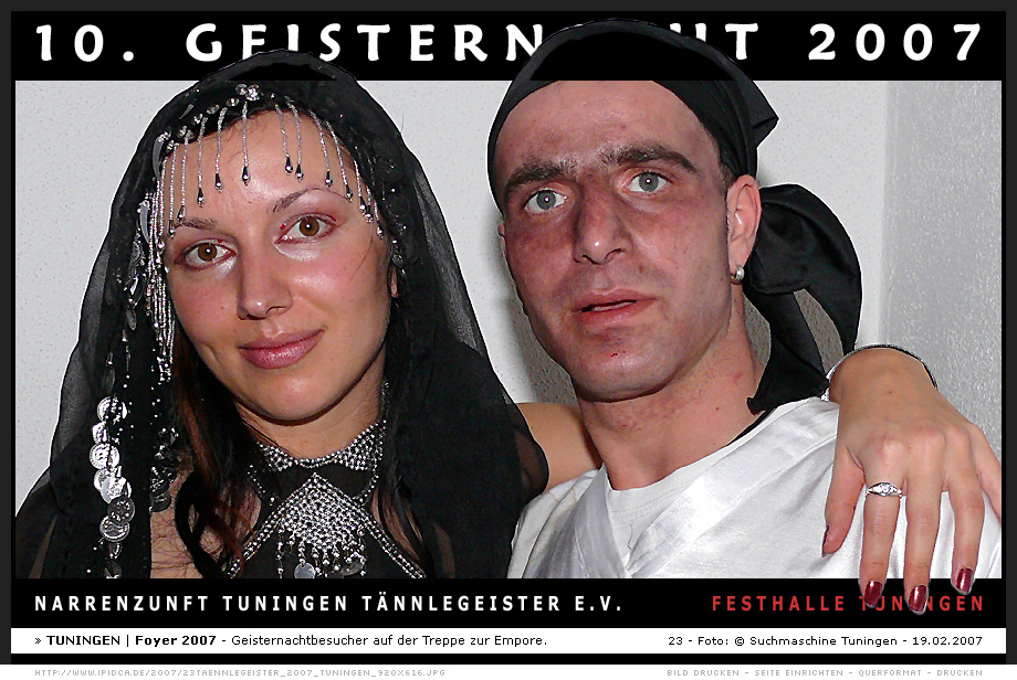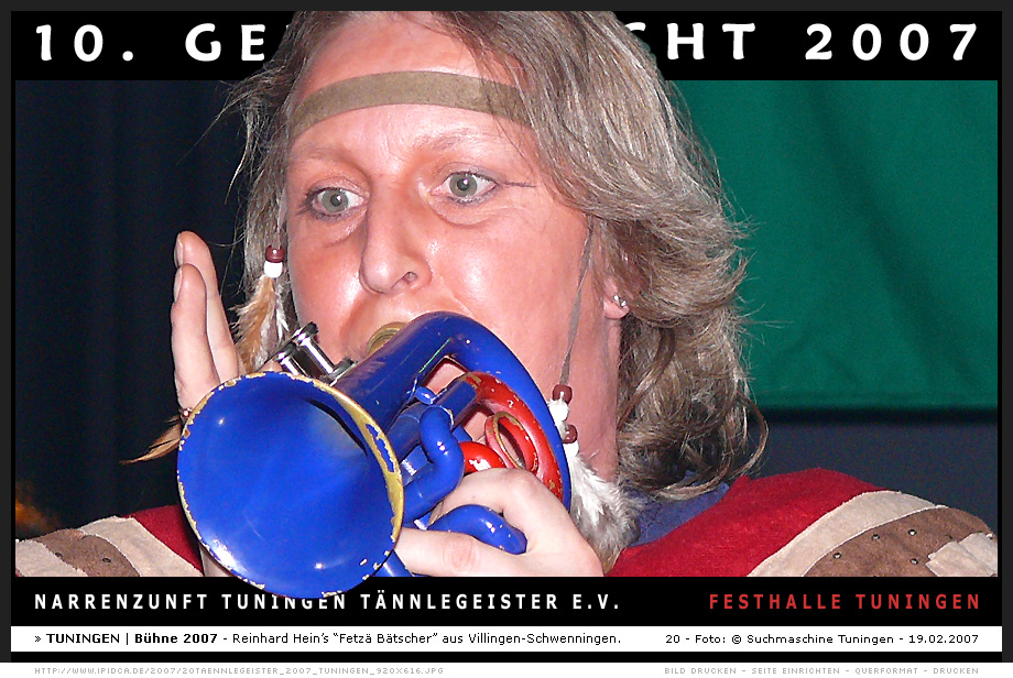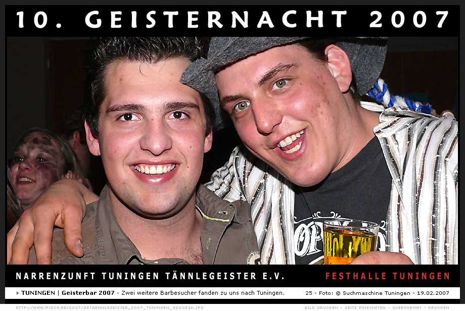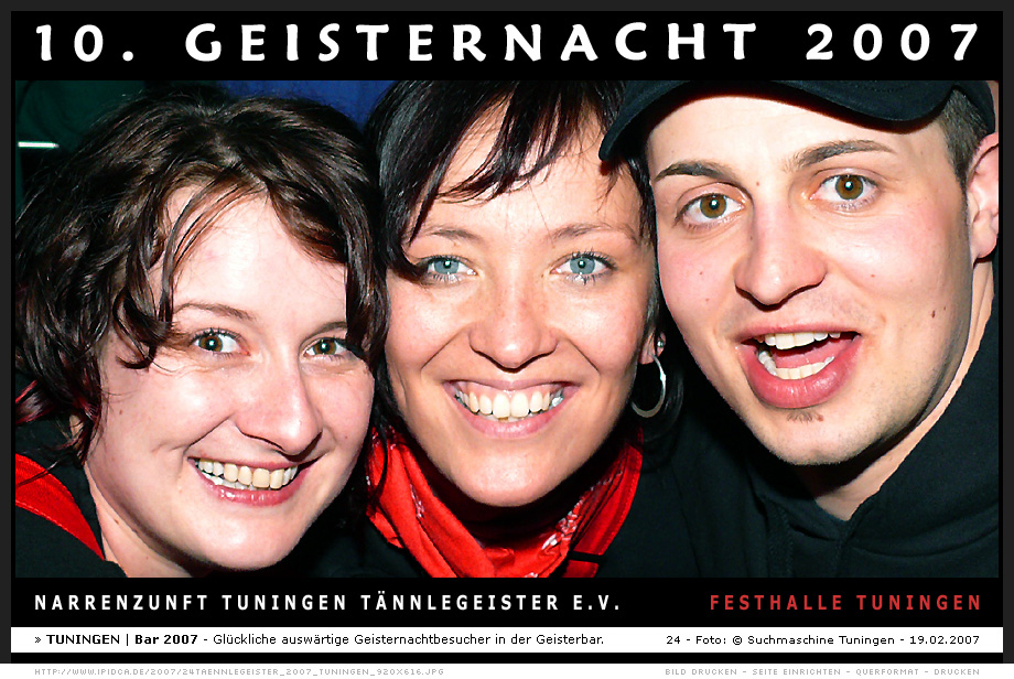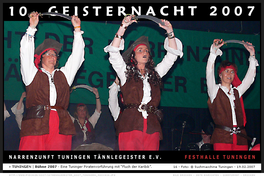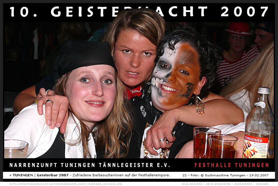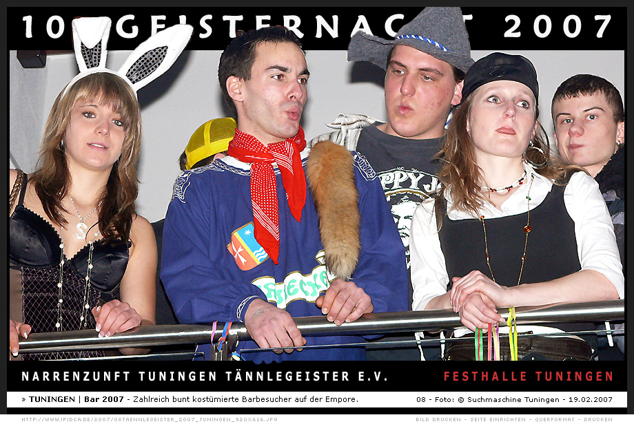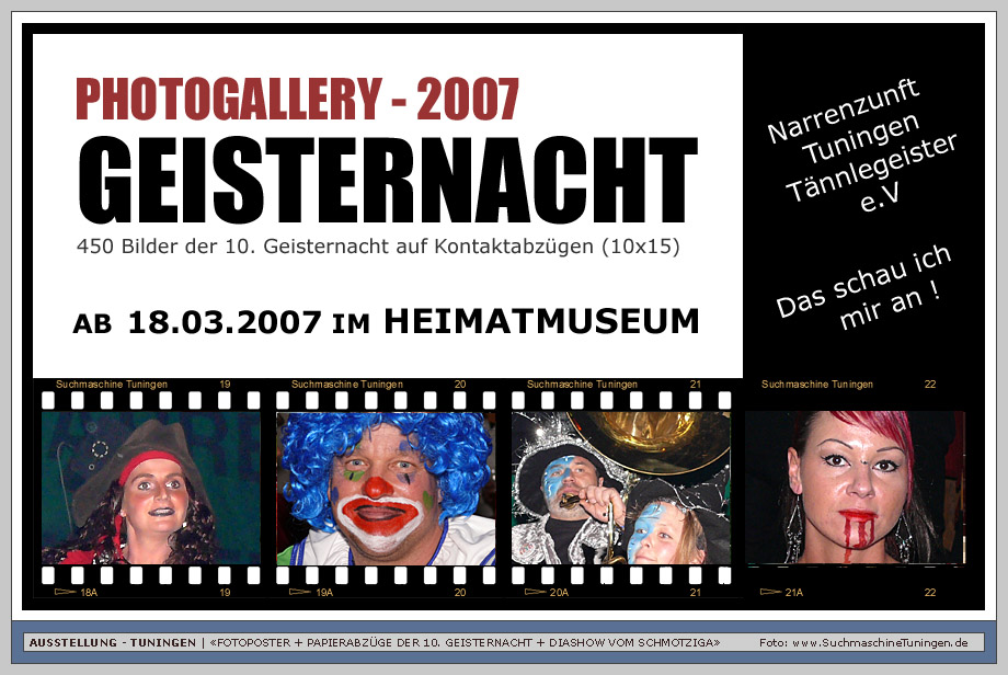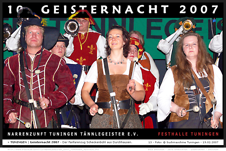 Die Tuninger Tännlegeister luden zur 10. Geisternacht am 19. Februar 2007 in die Festhalle um 20:01 Uhr ein. Blos Köpf sah man am Beginn des Abendprogramm nicht, als Udo Fischerkeller's Guggenmusik Emminger Blosköpf auftraten, denn sie trugen ein sehr schönes Kostüm und zogen 20 Minuten die Besucher in ihren Bann. Zum Heulen war den zahlreichen Besuchern und Zünften auch nicht, als anschließend Winfried Degen's Guggenmusik Tuninger Burgheuler auftraten. Nur ein kleines Fleckchen Zeit, nahmen sich die Neckar Fleckle von Andreas Hippe aus VS-Schwenningen. Guggenmusik Sunthausen e.V. - Die Taktlosen (1985): Um 22:00 Uhr formierte sich die überhaupt nicht taktlose Guggenmusik Die Taktlosen aus unserem südlichen Nachbarort Sunthausen im Foyer, und marschierten mit einer unglaublichen Energie und ohrenbetäubenden Schlag- u. Blasinstrumenten in einem fetten Rhythmus mit überproportionalen Masken, die mit leuchtenden Augen ausgestattet waren, auf die Bühne und den Bühnenvorbereich. 34 Minuten lang hatten Daniel Hug's 35 Taktlose die bebende Halle in der Hand. Die Tuninger Festhalle bebte wieder: Bebende Halle in Tuningen, den es heißt hier nicht nur "...die Hände in den Himmel" sondern auch mit "...den Füßen auf die Bänke. Mit einer Tanzvorführung der Jazztanzgruppe von Stefan Richt's Ziegel-Buben aus VS-Schwenningen ging es gar nicht büblich, sondern weiblich weiter. Nicht gescheckt, sondern sehr traditionell gekleidet trat der Fanfarenzug Scheckenbühl von Thomas Klietz aus der von Tuningen östlich liegenden Nachbargemeinde Durchhausen auf. Ein Fluch der Karibik war das Motto der spontanen Einlage von Tuningern mit ihrer Piratenvorführung, doch für die Besucher eine schöne Bereicherung. Guggenmusik Fetzä Bätscher aus VS (1994): Ordentlich gebätscht hat es bei dem Auftritt von Reinhard Hein's Fetzä Bätscher aus Villingen-Schwenningen. In sehr erdigen und stimmigen Farben gekleidet und mit dunkelhäutigen Masken bestückt, ließen es die Bätscher wieder krachen. Dann standen die "Glücksbärchen" Dominik Bury, Pascal Fritsche und Markus Wipf nach einem feuchten Strip auf einmal nur in Unterhosen auf der Bühne. In Tuningen tobte der Bär, den auch Stefano Caruso's Schwenniger Bären ließen sich das Tuninger Geisterspektakel nicht entgehen. Dieter Merz's Kötach-Buur der Narrenzunft Sunthausen fanden ebenfalls zur Geisternacht, denn sie mußten nur entgegen der Flußrichtung der Kötach entlang nach Tuningen laufen. Schlangenzunft Zarten e.V. (1951): Nicht nur die 30 Schlangen der Schlangenzunft Zarten von Markus Schwär aus dem Dreisamtal östlich von Freiburg, mußten sich ständig durch die Halle schlängen, sondern auch alle anderen zahlreich erschienenen Besucher um zum Beispiel in die Bar auf der Empore zu gelangen. Auch Helmut Overhage's Narrenzunft Weigheim und Ingo Kitzke's Narrenzunft Trossingen, ließen sich noch von den Alphas, einer Band die aus drei Männern und einer Frau besteht bis in die späten Morgenstunden begleiten. Narrenzunft Tuningen - Tännlegeister e.V. (1994): Wie Geister bewegten sich die Tuninger Tännlegeister durch alle Ebenen und Räume in der Tuninger Festhalle, überall und unermüdlich im Einsatz für die Partymeute. "S'war wied'r sche, abr s'isch au sche dasses wied'r vorbei isch und mo sich neue Kräf'd fürd näxschde "Jubiläumsgeisternacht" im Jahr 2008 hola ka." NACHTRAG: Am Dienstag, 20. Februar 2007 um 17:00 Uhr und einer Temperatur von (13,2 °C), wurde der Narrenbaum von Bürgermeister Jürgen Roth und dem Narrenvater der Tännlegeister, Uwe Bioni gefällt.