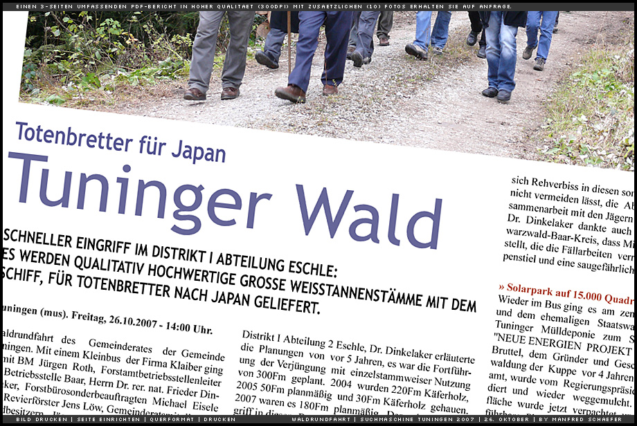 Waldrundfahrt des Gemeinderates der Gemeinde Tuningen. Mit einem Kleinbus der Firma Klaiber ging es mit BM Jürgen Roth, Forstamtbetriebsstellenleiter der Betriebsstelle Baar, Herrn Dr. rer. nat. Frieder Dinkelaker, Forstbürosonderbeauftragten Michael Eisele und Revierförster Jens Löw, Gemeinderatsmitgliedern, Waldbesitzern, Jägern, Pressevertretern und Waldinteressierten vom Tuninger Rathausvorplatz aus, zur Rundfahrt. » Eichenwaldpflege im Gewann "Konzenwies" » Es ging auf der L429 Richtung Schura zur 1 Ausstiegsstelle nach der Autobahnbrückendurchfahrt A81 rechts in den Nonnenbergweg hinein, mit Ziel Konzenwies. Nach dem Sturm "Wiebke" (Nacht vom 28. Februar auf den 1. März 1990) wurde aufgeforstet, die Eichen sollten alleine aufwachsen, da aber die Weiden vorwüchsig wurden, mußte eine Jungbestandspflege durchgeführt werden. Ein Jugendlicher aus Tuningen half bei den Entastungsarbeiten mit. » Flächiges hauen von Weißtannenbeständen » Distrikt I Abteilung 2 Eschle, Dr. Dinkelaker erläuterte die Planungen von vor 5 Jahren, es war die Fortführung der Verjüngung mit einzelstammweiser Nutzung von 300Fm geplant. 2004 wurden 220Fm Käferholz, 2005 50Fm planmäßig und 30Fm Käferholz gehauen. 2007 waren es 180Fm planmäßig. Der schnelle Eingriff in diesem Bereich, so Herr Löw war eine besonderes Sortiment von "Japanholz". Ein Einkäufer geht mit in den Wald und sucht sich starke qualitativ hochwertige "ruhige" Weisstannenstämme mit bis zu 5 Fm aus. Er gibt Trennschnitte an und läßt sie abholen. Per Lkw geht es mit den ganzen Stämmen bis Kehl und von dort aus mit dem Schiff nach Rotterdam (größter Seehafen Europas), wo sie in Autocontainern nach Japan verschifft werden. » Totenholz aus Weißtanne für Japan » Die Totenbretter werden in Japan aus den Stämmen hochkompliziert herausgesägt, eine Beschriftung eingebrannt und mit den Toten eingeäschert. Für die 130-150 Jahre alten Bäume wir ein Festmeterpreis von 130 erzielt. Die natürliche Verjüngung wir durch das ortsweise Lichten dieser "Baumriesen" begünstigt. Zum Wildverbiss durch Rehe erörterte Herr Löw, dass sich Rehverbiss in diesen sonnigen und ruhigen Lagen nicht vermeiden lässt, die Abschussquote und die Zusammenarbeit mit den Jägern laufe aber sehr gut. Herr Dr. Dinkelaker dankte auch dem Landratsamt Schwarzwald-Baar-Kreis, dass Mitarbeiter zur Verfügung stellt, die die Fällarbeiten verrichten, es sei kein Pappenstiel und eine saugefährliche und schwere Arbeit. » Solarpark auf 15.000 Quadratmetern » Wieder im Bus ging es am zentralen Gemeindewald und dem ehemaligen Staatswald vorbei in die alte Tuninger Mülldeponie zum Solarpark der Firma "NEUE ENERGIEN PROJEKT GmbH" von Alfred Bruttel, dem Gründer und Geschäftsführer. Die Bewaldung der Kuppe vor 4 Jahren durch das Landratsamt, wurde vom Regierungspräsidium Freiburg revidiert und wieder weggemulcht. Diese Deponieteilfläche wurde jetzt verpachtet und eine grosse nachführbare Photovoltaikanlage mit First-Solar Dünnschichtmodulen auf verzinkten Stahlrohrrahmen werden derzeit montiert. In der ersten Ausbauphase hat die Anlage eine Leistung von 500 Kilowatt Peak (kWp). Kilowatt Peak steht für Spitzenleistung (engl. Peak = Spitze). Diese Leistung wird bei maximaler sommerlicher Sonneneinstrahlung mit 1000 W/m² erreicht. Die Einspeisevergütung des Inbetriebnahmejahres bleibt für 20 Jahre gleich. Für eine in 2007 in Betrieb genommene Freilandanlage erhält der Betreiber derzeit 37,95 Cent/kWh. Die aktuellen Konditionen für Privatkunden der EnBW Komfort (Grundversorgung inkl. 19 % Umsatzsteuer), beträgt 19,42 Cent/kWh (Verbrauchspreis). Unterhalb am Solarhang findet derzeit auch ein größerer Einschlag im Rahmen einer regulären Durchforstung statt. » Neues Oberflächendichtungssystem auf 7,2 ha » Am 31.12.1997 wurde die Tuninger Mülldeponie stillgelegt, um die Sickerwasserkosten unter Kontrolle zu haben, muß für ca. 3,3 Mio. Euro in diesem Bereich ein neues Oberflächendichtungssystem eingebaut, und das Solarpanelfeld wieder ab- und aufgebaut werden. Da alle Stilllegungs- und Nachsorgekosten der nächsten Jahrzehnte bis ca. in das Jahr 2047 (50 Jahre) in die aktuellen Müllgebühren eingerechnet werden, kommt das den Schwarzwald-Baar-Kreis und somit den Verbrauchern teuer zu stehen. » "Endgültiges" Oberflächendichtungssystem » Dabei wird auch die 1,5 ha große Photovoltaikanlage der Solarfirma abgebaut, der Oberboden abgeschoben und die Flächen verdichtet. In Bereichen von Senken wird mit mineralischem Dichtungsmaterial aufgefüllt. Danach wird eine 2,5 mm starke Kunststoffdichtungsbahn (KDB) ausgelegt. Nach Aufbringung einer Drainageschicht von 30cm wird als Abschluß eine 2m dicke Rekultivierungsschicht für eine vorgesehene Teilbewaldung aufgebracht. Danach kann das Solarfeld wieder aufgebaut werden. Die Planungen für diese Maßnahme laufen bis 2008, 2008 soll die Ausschreibung sein und 2009/2010 könnten die Arbeiten durchgeführt werden. » Ausgleichsfläche für Powerfarmgelände » Nach der Durchfahrt des Deponiegeländes wurde an der K5711 der vorletzte Halt gemacht. Da beim Bau der Biogasanlage der Firma Powerfarm vor dem Mülldeponiegelände im Gewann "Brennt" an der Kreisgrenze Wald verloren ging, muß die Firma eine Ausgleichsfläche, die auf dem ehemaligen Erddeponiegelände aus den 90er Jahren gefunden wurde, finanzieren. Auf dem Gelände an der Talheimer Straße wurde eine mögliche Ersatzaufforstung besprochen. 1,7 ha sollen vorwiegend mit Laubholz (Eiche) ohne Zaun nur mit Verbissschutzhülsen realisiert werden. Da die Powerfarm'ler ihre Betriebsgröße verdoppeln und in die Biomethanproduktion einsteigen wollen, wird eine Vergrößerung der Ausgleichsfläche wahrscheinlich. Die Idee von Hans Glökler hier ein kleines Versuchsfeld mit Energiewald einzurichten, konnte die Forstleute nicht überzeugen, weil so Herr Löw bereits andere Bestände im Tuninger Wald zur Zerhackschnitzelung verwendet werden könne