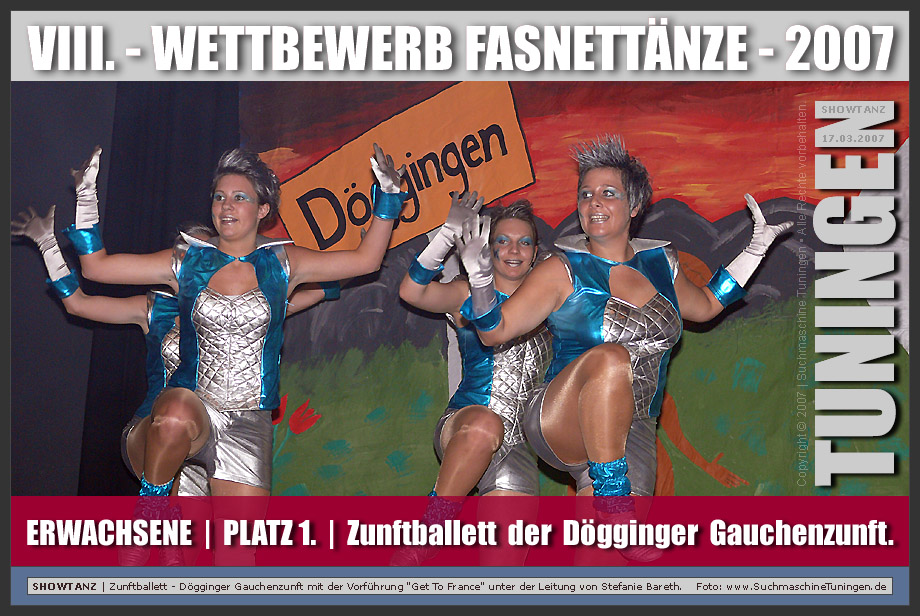 Die für die Fasnet einstudierten Tänze der 15 teilnehmenden Gruppen in der Kategorie Erwachsene und Jugendliche am Samstag begeisterten das Publikum mit ihren abwechslungsreichen Tänzen und Hebefiguren. Herr Helmut Erbis, der Vorstand der Turngemeinde Tuningen begrüsste das Publikum, die Gruppen und die Punkterichter. Dann gab er das Wort an die sehr nette und routinierte Moderatorin Barbara Gruler weiter, die die einzelnen Tanzgruppen vom Vereinsnamen, bis hin zur Gruppenstärke, Alter und dem Trainingsaufwand und ihren Erfolgen, jeweils vor ihren Auftritten vorstellte. Zunftballett von der Dögginger Gauchenzunft: Das Zunftballett von der Dögginger Gauchenzunft landete mit ihrem Auftritt in Tuningen nicht nur mit ihrem Ufo in Tuningen, sondern gleichzeitig auch auf Platz 1. in der Gesamtwertung in der Wettkampfkategorie 3 (Erwachsene). Trainerin Stefanie Bareth verzauberte mit ihren 8 Damen die Punkterichter und das Publikum in der Tuninger Festhalle. Mit dem Titel "Get To France" von Novaspace, einem eigens angefertigten großformatigen Bühnenhintergrundbild und einer exzellenten Choreographie, einer perfekten tänzerischen Umsetzung und stimmigen Kostümen mit der passenden Schminke, eben die gesamte Performance verhalf dem Zunftballett Döggingen zu 46.5 Punkten. "X-Dream" des SV Mariazell: Die Vorjahressieger von 2006, die "X-Dream's" des SV Mariazell unter der Leitung von Natascha Auber & Bianca Gaiselmann erreichten mit der Showtanzvorführung "Flippers oder ausgeflippt ?" 45.0 Punkte von maximal 60 erreichbaren Punkten und verpassten nur sehr knapp einen erneuten 1. Platz in Tuningen. Die "Monday Dancers" aus Hausen: (Nur) den 3. Platz gab es mit 40.5 Punkten für Hausen mit den "Monday Dancers" von Karin Weinmann und Joggi Kammert. Nein nicht nur, denn mit ihrer sehr gelungenen "Dschingis Khan" Vorführung hätten sie gut und gerne auch den 1. oder 2. Platz erreichen können, aber mit der Bewertung der einzelnen Gruppen ist es eben immer so eine Sache. Es gehört nicht nur fleissiges Training, die meissten Gruppen trainieren 2 x die Woche, sondern auch immer etwas Glück dazu, um eben in diesem Moment der Vorführung die Jury von sich zu überzeugen. Es ist schon bewundernswert, wie z.B. die "Monday Dancers ", die sich im Alter von 24 bis 42 Jahren befinden, fit sind und Spaß an ihren Auftritten und der sportlichen Bewegung haben. Jede Gruppe stellte einen Punktrichter (Notenskala 1-10 in 0.5er Schritten), wobei folgendes Ergebnis erfolgte.