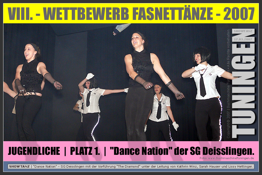 - P 01 | Döggingen - Zunftballett 46.5 Punkte. - P 02 | SV Mariazell - X-Dream 45.0 Punkte. - P 03 | Hausen - Monday Dancers 40.5 Punkte. - P 04 | TG Seitingen-Oberflacht 38.0 Punkte. - P 05 | Sunthausen - Hot Shoes 34.0 Punkte. - P 06 | TV Spaichingen - Maxi Shiva 30.0 Punkte. - P 07 | Blumberg - C'est la vie 29.5 Punkte. Die "Dance Nation" aus Deisslingen: Platz 1. mit 62.0 Punkten von max. 70 in der Wettkampfgruppe 2 (Jugendliche 14 - 18 Jahre) erreichte die "Dance Nation" der SG Deisslingen mit der Vorführung "The Diamond" unter der Leitung von Kathrin Winz, Sarah Hauser & Lissy Hettinger, sie lagen 2006 auf Platz 2. mit 60.5 Punkten. Die Sportgemeinde Deisslingen muß eigentlich in Tanzgemeinde Deisslingen umbenannt werden, denn auch die "Sixteens" der SG Deisslingen erreichten in diesem Jahr am Sonntag den 2. Platz bei den Kindern (bis 13 Jahre) in Tuningen. Die "Mittlere Showtanzgruppe" aus Geislingen: Das Tanzballett der Narrenzunft Geislingen, die "Mittlere Showtanzgruppe Geislingen" unter der Leitung von Katrin Schädle und Melanie Kohle erreichten den 2. Platz mit 62.0 Punkten (Vorjahressieger). Auch Geislingen ist eine erfolgreiche Showtanzgruppengemeinde, denn auch die Kinder erreichten am Sonntag in Tuningen wieder den 1. Platz mit dem "Kleinen Tanzballett Geislingen". Die "Mad Moves" aus Mariazell: 3ter wurde die Nachwuchs-Showtanzgruppe des SV Mariazell die "Mad Moves" mit 45.5 Punkten unter der Leitung von Natascha Auber und Bianca Gaiselmann mit der Vorführung "Piraten - Fluch der Karibik".