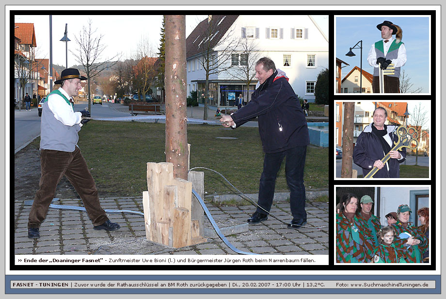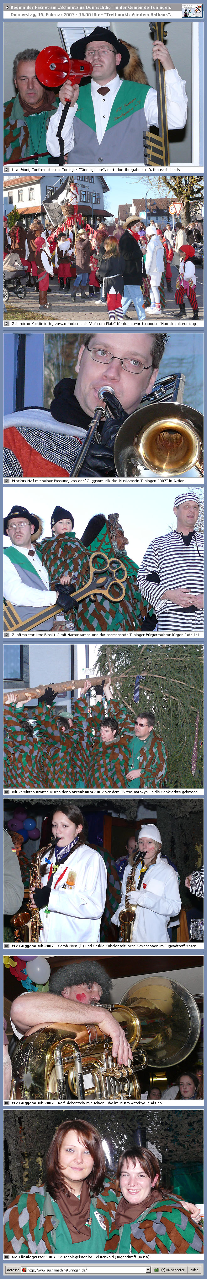 Tuningen, eine kleine selbständige Gemeinde mit knapp 3000 Einwohnern im Schwarzwald Baar Kreis wurde wieder von den Narren erobert. Morgens wurden die Schüler am [Schmotziga Dunnschdig] von den [Tännlegeistern] von der Schule befreit. Am Nachmittag veranstalteten die "Geister" die 1. Kinderfasnet in der Festhalle. 2h wurde den 80-100 Kindern, Spannung, Spiel & gute Laune geboten. Würste, Kaffee u. Getränke und selbstgemachter Kuchen von den Mitgliedern der Tuninger Narrenzunft trugen zum Gelingen der Premierenkinderfasnet bei. Disco von DJ "Uwe" mit Spielen und Preisen ... : Mit einer Disco von DJ "Uwe Plonka" und versch. Spielen mit Preisen, wurde bis zum Eintreffen der Guggenmusik Tuninger Burgheuler eine gute Party gefeiert. Gemeinsam ging es dann lautstark den "Schulberg" hinauf zum Rathausvorplatz in der Ortsmitte. Die Guggenmusik des Musikverein Tuningen und die Burgheuler heizten den zahlreich erschienenen kostümierten Besuchern ein, bis Zunftmeister Uwe Bioni die ganze "Heerde" vor den Jugendtreff Hasen, schräg gegenüber des Rathauses beorderte. Bekanntmachung der neuen Zunftstube im "Hasen" : Da sich die Tännlegeister in diesem Jahr eine Zunftstube im Obergeschoss des "Hasen" eingerichtet haben und sich das Büro von Bürgermeister Jürgen Roth im rückwärtigen Bereich des Rathauses ebenfalls im OG liegend befindet, haben sie sich etwas Besonderes einfallen lassen. An einer langen Schnur entlang, machte sich der Rathausschlüssel über den Köpfen der Tuninger Narrenbevölkerung auf den Weg vom Rathaus in die Zunftstube. Das anfängliche Zögern vom BM half ihm nichts, denn er wurde durch Zunftmeister Uwe Bioni und durch die lauten Guggen von der vorübergehenden Machtpause im Rathaus überzeugt. Gemeinsamer Umzug in einer kleinen Schleife : Der Zunftmeister und Hästräger der Tännlegeister steckten den BM in ein Sträflingskostüm und in einer kleinen Schleife ging es mit dem Hemdklonkerumzug durchs Ort, wo die bunt geschminkten Narren mit Nachthemden und Zipfelmützen lärmend durch die Strassen liefen. Das Ziel war der Platz vor dem Bistro Antokya bzw. der Kreissparkasse wo der große und geschmückte Narrenbaum gesetzt wurde, der die Übernahme der Amtsgewalt bis zum Fällen am Dienstagabend um 17.00 Uhr anzeigt. Die Tanne ist das deutliche Zeichen der 5. Jahreszeit im Ort, und wurde in mühevoller Handarbeit unter Anweisung des 2. Vorstand der Tännlegeister Karl Reich, sehr schnell in die Höhe gestemmt und fest im Boden verkeilt. Mit viel Muskelkraft wurde der Narrenbaum gesetzt : In Tuningen wird der Baum nach traditioneller Art mit viel Muskelkraft in die Senkrechte gebracht, deshalb heißt dieser Brauch hier Narrenbaum setzen und nicht Narrenbaum stellen. Nun begann das närrische Treiben in den Besenwirtschaften der Vereine und in den Gaststätten.