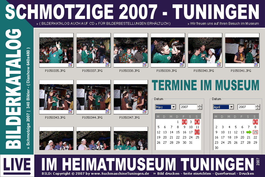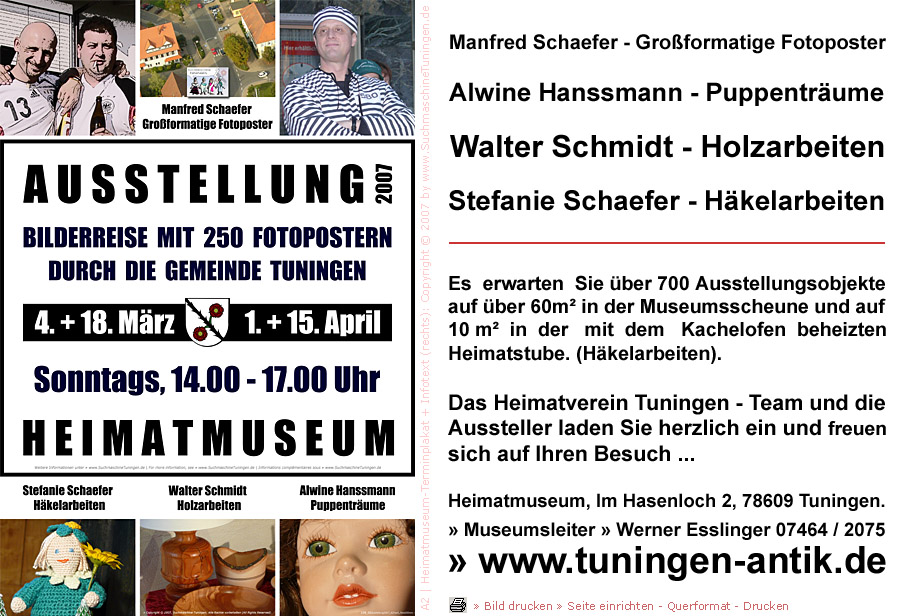 Unzählige Exponate, wie Tuninger Fotografien, Häkel- und Drechselarbeiten sowie kunstvolle Puppen können im Heimatmuseum, das sich hinter dem Tuninger Rathaus befindet (Im Hasenloch Nr. 2), besichtigt werden. Herr Werner Esslinger der Vorstand des Heimatverein Tuningen, eröffnete die Ausstellung und überließ den zwei Dutzend Gästen die vielfältige Ausstellung des Tuninger Quartett's mit Manfred Schaefer, Stefanie Schaefer, Walter Schmidt und Alwine Hanssmann. Gleich am Anfang der Museumsscheune stiess man auf großformatige Poster mit Fasnetbildern der Tuninger Narrenzunft, der Tännlegeister. Manfred Schaefer - Großformatige Fotoposter: Der Tuninger Hobbyfotograph Manfred Schaefer offeriert einen breiten Einblick seines Schaffens. Gehen Sie mit auf eine Bildreise durch die Gemeinde Tuningen mit ihrem facettenreichen Dorfleben. Die hochwertigen und hochaufgelösten Drucke wurden auf Posterkarton im Digitaldruck hergestellt. Sie enthalten meißt plakative Texte mit großen Überschriften und kurzen Textbeschreibungen. 150 Bildposter an den Wänden und mehr als 250 in zahlreichen großformatigen Präsentationsmappen, werden durch 100 Fotos im kleineren Format, zahlreiche laminierte Fasnetposter 2007 und verschiedene Diashows auf dem Notebook ergänzt. Ob Fasnetbilder, Spass (Race to fun), Ausstellungen, Kirchengemeinde, Musikverein, Sportverein, Gemeinde, Projektchor, Wald, Tänze, Volleyball, Heimatverein, Museum, Natur, Friedhof, Theater, Dorfweihnacht, Kunst, Weihnachten oder Gräben, alles ist vertreten. Selbst Kalender 2007, ein eigener Ortsplan, viele Luftfotos, Winteransichten und Sommeransichten sind vertreten. Auf ein einheitliches Layout (Wiedererkennungseffekt) für Poster mit mehr als einem Poster wurde geachtet und in Gruppen zusammengefasst. Mit einem selbstangefertigten Hängesystem, mit Stahlseilen und Bilderhaken wurden die auf Präsentationspappe bzw. Kappa Sandwichplatten aufgezogene Poster in die Galerieschienen des Museums eingehängt. Stefanie Schaefer - Häkelarbeiten: Um ihr Renterdasein sinnvoll zu erweitern, häkelt und umhäkelt die seit 1962 in Tuningen lebende "Heubergerin" Stefanie Schaefer seit 2,5 Jahren fast alles was Sie in die Finger bekommt. Fast nichts scheint unmöglich, über 30 verschiedene Häckelmotive in wiederum verschiedenen Variationen, können in der Stube des Museums bestaunt werden. Eine unglaubliche Geduld muß von Nöten gewesen sein, um diese zum Teil sehr filigrane über 100 Kunstobjekte aus reiner Baumwolle anzufertigen zu können. Gehäkelt wurden Deckchen und Untersetzer in allen Formen und Farben, Schmetterlinge und sehr schöne kleine Wichtelpärchen. Umhäkelt, Blumentöpfe, Körbchen, Herzen, Sektkorken, Sprudelflaschenschraubverschlüße, Kleiderbügel, Ostereier und vieles mehr. Ein ganzer Weihnachtsbaum mit umhäkelten Sternen, Engeln, Echtglaskugeln und Glöckchen, kann in der Heimatstube besichtigt werden. Alwine Hanssmann - Puppenträume: Die 1928 in Rötenberg geborene Alwine Hanssmann, lebt seit 1947 in Tuningen. Sie fertigt seit vielen Jahren 50cm große Puppen in einer unglaublichen Präzision an, sofort wird der Betrachter beim Anblick der 9 ausgestellten Puppen verzaubert. Ob die Biedermeierpuppe, das Tuninger Tracht Pärchen, das Brautfräulein, Katja Ebstein, der Schwarze, die Thailänderin oder der Junge mit der Mundharmonika. Die Vorbilder entdeckt die talentierte Tuningerin nicht aus der Fachliteratur, sondern aus eigenen Ideen. Für eine Puppe und deren Accessoires ist Sie mindestens 2 Wochen beschäftigt. Keine Puppe gleicht der anderen - Jede Puppe ist ein echtes Alwine Hanssmann Unikat. Kopf, Arme und Füße werden in feinstem Porzellanguß selbst gefertigt, feingeschliffen und bemalt und Details feinst herausgearbeit. Die Porzellanteile bekommen beim Gießen Löcher, in die Metalldrähte zur Befestigung am Körper eingeführt werden. Wimpern, die Finger- und Zehennägel wurden ebenfalls lebensecht gestaltet. Die Körper der Puppen sind aus weichem Baumwollstoff, die mit Baumwolle gefüttert sind. Die Puppe "Katja Ebstein" hat soger Echthaare bekommen. Schnittmuster (Papierschablonen) werden angefertigt um diese dann später auf den Stoff übertragen und die Kleider nähen zu können. Walter Schmidt - Holzarbeiten (Drechseln): Herr Walter Schmidt ist gebürtiger Siegerländer und erblickte 1938 das Licht der Welt, er ist 1974 nach Tuningen gekommen. Er ist gelernter Dreher ( Metallbereich, Leit- und Zugspindeldrehmaschine ) und wollte ursprünglich Schreiner lernen, was dann aber leider nicht in Erfüllung ging. Er holt sich die Vorlagen für seine 4te Ausstellung aus Büchern und vielen eigenen Ideen. Bevorzugt verwendet er das Holz von abgestorbenen Tuninger Obstbäumen, wie Birne, Apfel, Zwetschge oder seinem Lieblingsholz Kirsche. Aus seinem Holzlager, mit jahrelang getrockneteten Baum- und Aststücken, drechselt er ein vielfältiges Spektrum. Alltagsgegenstände wie Hocker, Schalen, Löffel, Kerzenständer, Pfeffermühlen, Wellhölzer, Mörser oder Eieruhren. Aber auch sehr dekorative Uhrengehäuse, Sanduhren, kleine Bäumchen und Pilze, Äpfel, Birnen oder Schlüsselanhänger und Kugeln. Viele Stücke sind nicht aalglatt, sondern zeigen zum Teil natürliche Verformungen, Einschlüsse und Risse, was vielen Objekten den besonderen Charakter gibt. So drechselte er zum Beispiel eine Schale aus nassem Holz und ließ sie dann lange trocknen, bis er dann nur das Innere feindrechselte, so bekam die Schale außen eine ovale Form. Die Objekte werden nach dem Feinschliff lackiert, gewachst oder geölt, wobei diese verschiedenen Oberflächenfinishverfahren zum Teil in Kombination zum Einsatz kommen, was den Objekten einen glatten aber dennoch sehr griffigen Touch gibt. Wenn ihm sein ehemaliger Arbeitskollege Angelo ein Aststück eines Olivenbaumes aus dem Urlaub in Sizilien mitbringt, drechselt Walter Schmidt auch mal eine Vase aus "Fremdholz". «Des raucht dann beim drechseln unheimlich», so der Holzküns
