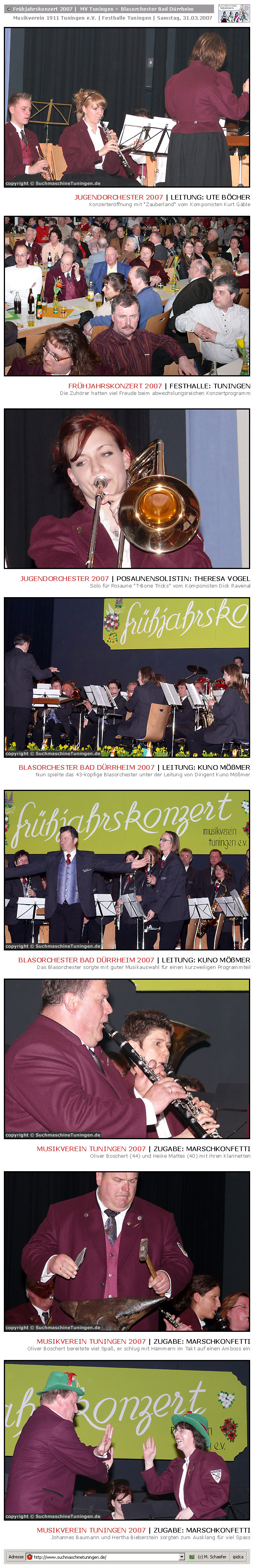 Großen Anklang fand der bunte dreiteilige Konzertabend mit dem Frühjahrskonzert des "Musikverein 1911 Tuningen e.V." und dem Blasorchester Bad Dürrheim in der Festhalle Tuningen. » Der Vorstand des Musikverein, Erich Bieberstein » Der Vorstand des Musikverein, Herr Erich Bieberstein begrüßte die musikinteressierten Gäste recht herzlich und betonte, dass sie hinter dem Musikverein Tuningen und hinter der Blasmusik stehen. Eröffnet wurde der bunte musikalische Abend vom Tuninger Jugendorchester unter der Leitung von Ute Böcher mit dem Konzertstück "Zauberland" vom Komponisten Kurt Gäble. Ein schöner Sonntagmorgen inspirierte den Komponisten Kurt Gäble zu seiner attraktiven Komposition "Zauberland", die Ruhe aber auch eine gewisse Abwechslung schildern seine Eindrücke von diesem Tagesbeginn, so Florian Bieberstein der Moderator des Jugendorchester. » T-Bone Tricks vom Komponisten Dick Ravenal » Nun lud das Jugendorchester zu einem spanischen Fest ein, in dem fröhlichen Stück "Fiesta" vom Komponisten Fritz Neuböck nahm das Orchester die Besucher mit nach Spanien und vermittelten so die Lebensfreude der Bewohner Spaniens. Jetzt galt die ganze Aufmerksamkeit des Publikum Theresa Vogel mit ihrem Solo für Posaune. T-Bone Tricks hieß das Stück vom Komponisten Dick Ravenal, das Sie mit Bravour auf der Bühne präsentierte. Die Kompositionen "T-Bone Tricks" ist unter dem Pseudonym "Dick Ravenal" erschienen, das Stück komponierte der am 30. September 1938 in Amsterdam geborene Komponist und Musiker Kees Vlak. » Zweiter Teil des Konzertabends » Das Blasorchester Bad Dürrheim (Mitglied im Blasmusikverband Schwarzwald-Baar e.V.) unter der Leitung von Kuno Mößmer, eröffnete den zweiten Teil des Abends mit dem Konzertmarsch "Bandology" vom Komponist Eric Osterling, gefolgt von "Meister der Ouvertüre" vom Arrangeur Thorsten Reinau, einer Zusammenstellung wunderschöner Opernmelodien. In dem dritten Stück von Peter Kleine Schaars arrangierten Jazzklassiker "Autumn Leaves" vom Komponist Joseph Kosma & Jacques Prevert, wurde der Abschied vom Herbst in den verschiedensten Klangfarben wiedergegeben. » "Lord of the Dance" von Ronan Hardiman » Mit dem vierten gespielten Stück "Lord of the Dance" vom Komponist Ronan Hardiman und Arrangeur Johnnie Vinson, ist die irische Tanzsensation Michael Flatley mit seiner Tanzgruppe und dem Stepptanz weltweit bekannt geworden. Seine Tanzgruppe tourt weltweit und ist dieses Jahr auch in Deutschland.