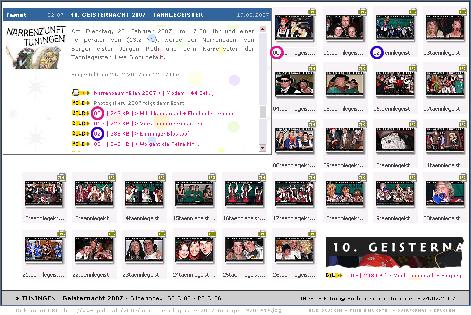 Eventuell kann die Suchmaschine Tuningen im Jahr 2008 ein Gruppenfoto von den fleissigen Organisatoren und eines mit den vielen Helfern machen.- P 01 | Spandalenballett - Kinder Geislingen - 82.5 Punkte. - P 02 | Sixteens - SG Deisslingen - 74.0 Punkte. - P 03 | Hagen-Henker-Zunft - Beffendorf - 63.0 Punkte. - P 04 | junior jazz - Turnverein Beffendorf - 56.0 Punkte. - P 05 | Kinder - Aixheim - 54.0 Punkte. - P 06 | jazz4dance - TSV Dunningen - 50.0 Punkte. - P 07 | Cracy nice girls - NZ Dauchingen - 47.5 Punkte. - P 08 | Dance Kids - TG Trossingen - 47.0 Punkte. - P 09 | Ziegelbuben - VS-Schwenningen - 46.0 Punkte. - P 10 | dance girls - Frittlingen - 45.0 Punkte. - P 11 | Sugar Girls - TG Trossingen - 41.0 Punkte.